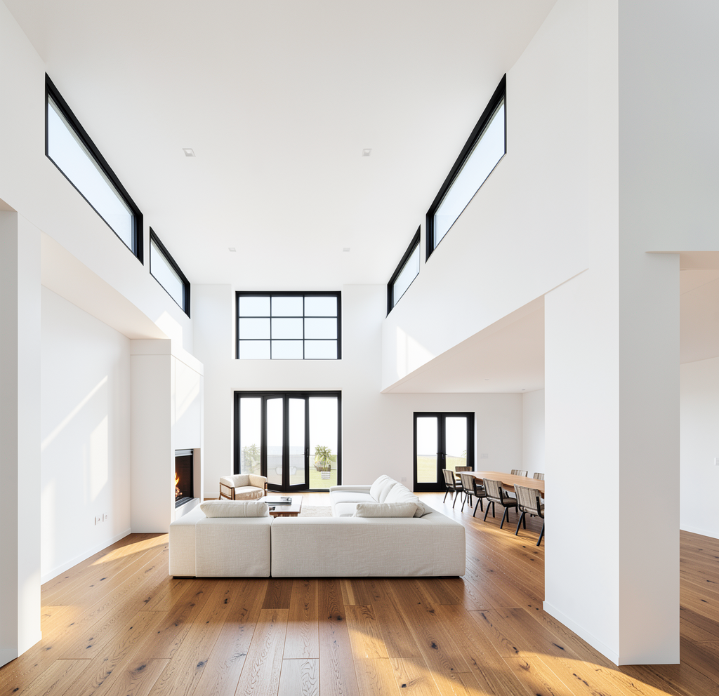 white interior walls black window and door frames wood flooring fireplace on the left side chandelier from ceiling in the middle fireplace black stone wall