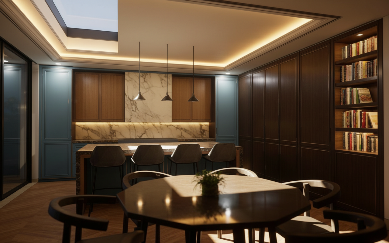 transform the provided image into a high end photorealistic render with a bright sunny daytime atmosphere the design and layout must remain exactly the same with no changes to geometry proportions or object positions all walls openings ceiling and skylight coving cabinetry island shelving table and chairs floor pattern and glazing must stay unchanged with nothing moved added removed or resized the glazing on the left hand side must clearly show direct sunlight and a garden beyond with strong natural daylight entering the space casting realistic sun patches and soft directional shadows across floors cabinetry and the island all cabinetry on the right hand side must remain entirely timber finished rendered in a light contemporary walnut with a matt surface and refined natural wood grain any painted cabinetry elsewhere should be finished in a deeper darker blue tone maintaining a contemporary interpretation of traditional panelling with all panel proportions door sizes and detailing kept exactly as modelled and with timber accents retained around edges and junctions where indicated in the image the kitchen worktops and backsplash must be rendered in a light marble keeping their exact dimensions and alignment with subtle veining realistic edge detailing and soft daylight reflections the marble island must match the same light marble finish and retain its exact form lighting must be simplified so that all direct artificial lights are removed retaining only indirect lighting within the coving and concealed locations set to a soft neutral tone that supports the daylight rather than overpowering it overall material realism should be enhanced through accurate daylight reflections clear shadow definition and balanced contrast achieving a calm refined and contemporary residential kitchen with a bright sunlit character