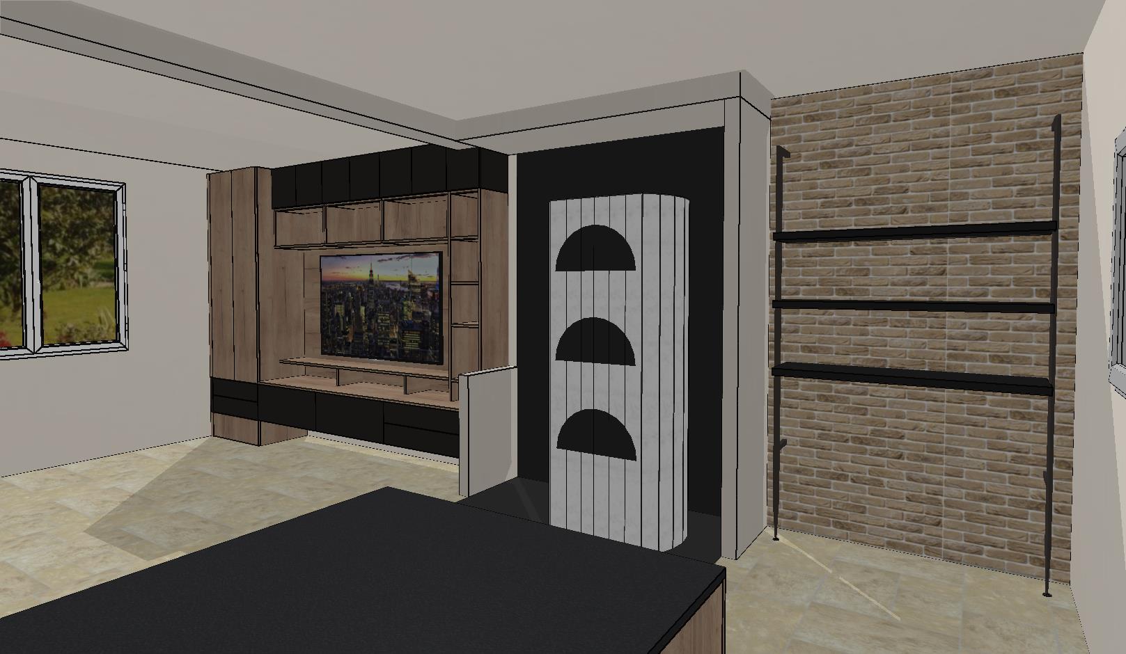 ajoute des buches de bois sous les tag res droite et de la d coration dans le meuble de gauche conserve les couleurs et les textures de l image