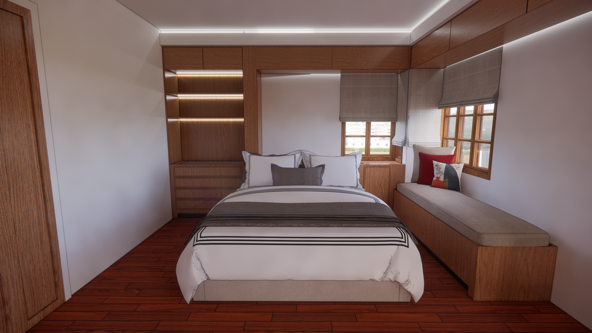 render a cozy and modern bedroom with a minimalist aesthetic the floor is a rich mahogany wood giving warmth to the room the bed has crisp white linens with subtle geometric black accents a gray bed runner adds a touch of elegance the cabinetry and window frames are a light natural wood harmonizing with the floor light gray roman blinds cover the windows allowing soft natural light to fill the space creating a calm and inviting atmosphere the bench by the window is a neutral beige complemented by accent pillows in muted earth tones and a splash of red and orange for contrast led lights create a soft ambient glow around the ceiling and shelving areas enhancing the serene environment