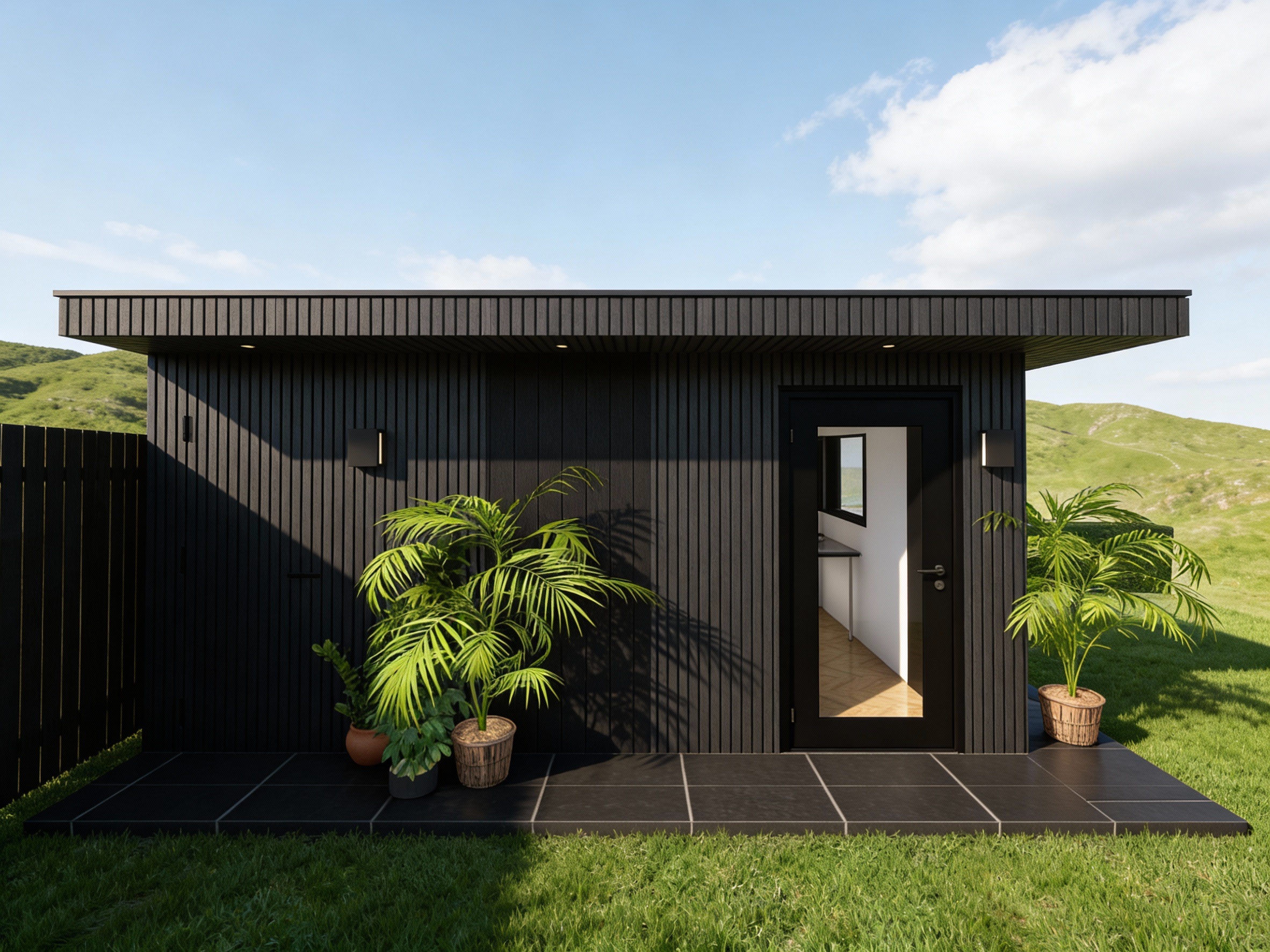 modern minimalist waiting room of a clinic the clinic is located in a plaza that is only separated by a glass portal on the right and left sides of the cladding change line the interior of the indoor plaza is slightly reflected in the glass with light oak furniture and cladding made of light wood modern light gold metal legs the padded beige chairs are normal natural light the l illuminating the white slightly marbled slightly shiny floor the atmosphere is calm and serene with a touch of sophistication the walls are decorated with soft neutral shades of textile effect wallpaper wooden furniture and cladding elements are light oak the quality of the rendering should be maximum with a realistic effect which is especially noticeable in the textures hidden lighting the two types of plants lyreleaf ficus ficus lyrata with a realistic appearance