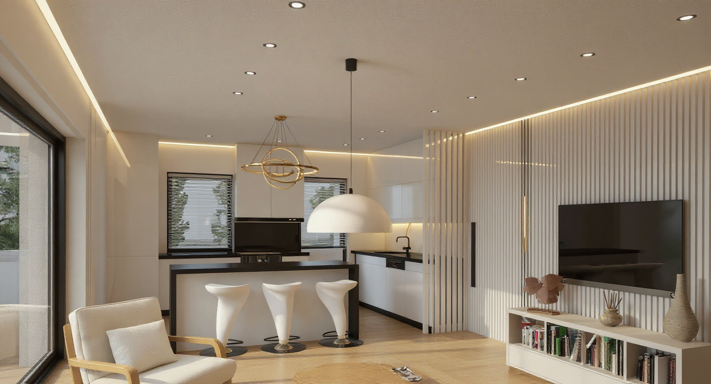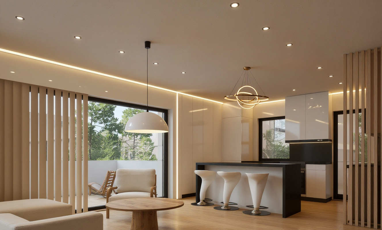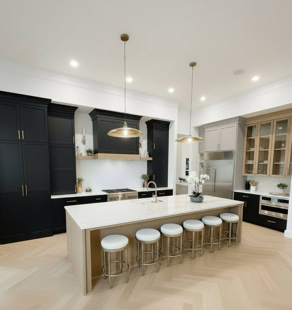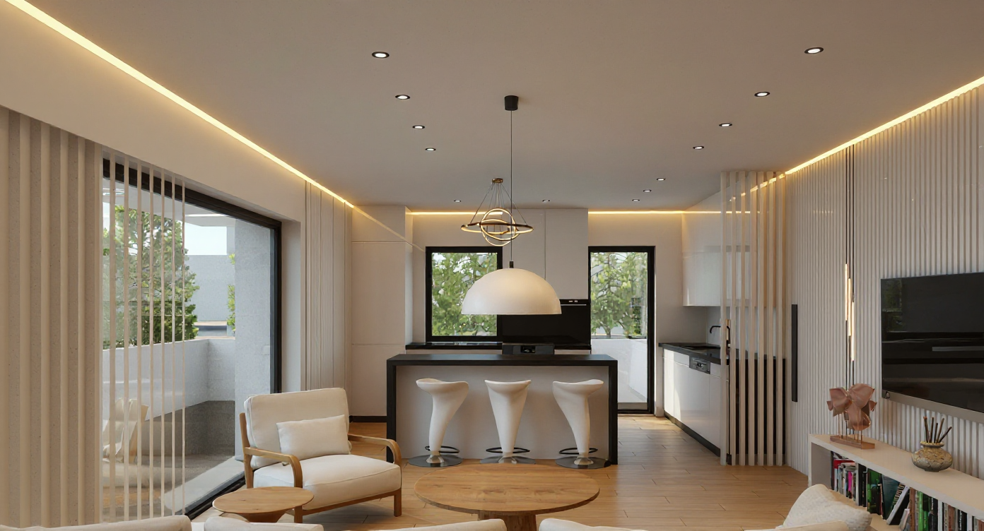only the windows next to the kitchen counter should have horizontal white blinds that start from the ceiling