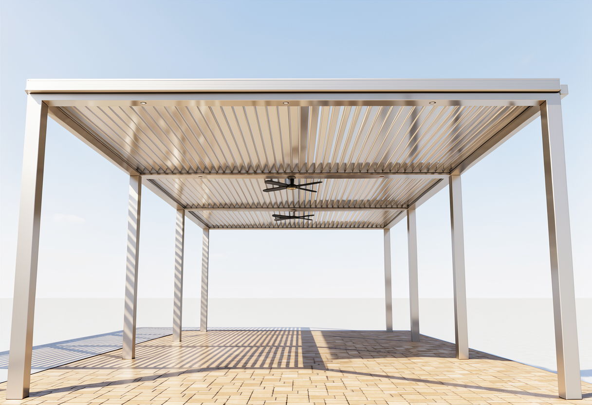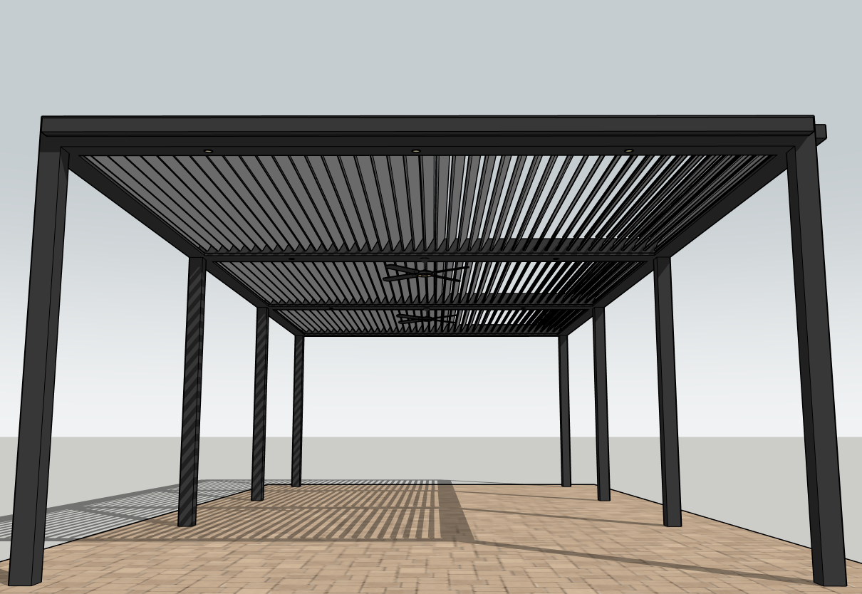 make this into a nice aluminum louvered roof make the frame a darker grey color add a nice back round with some tall pine trees