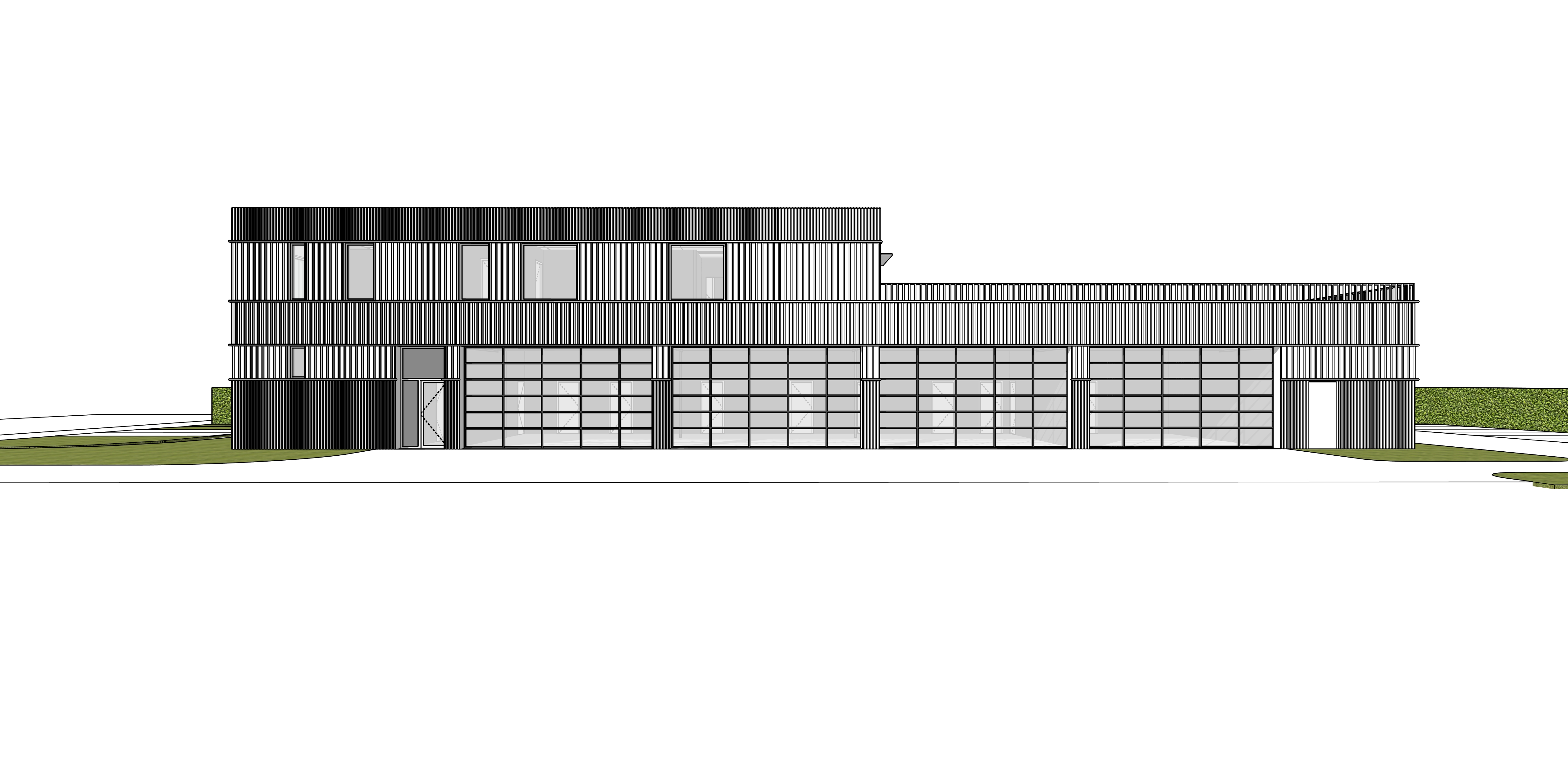 maak een visual op basis van de ingevoerde afbeelding neem het gebouw exact over zoals het in de afbeelding staat zonder vormaanpassingen het is een ambulancepost in nederland de gevelbekleding bestaat uit een geprofileerde staalplaat in donker antracietgrijs ral achtig mat houd het aantal ramen deuren en garageopeningen exact gelijk aan de aangeleverde afbeelding plaats maximaal 10 personen op de voorgrond subtiel en niet dominant geen mensen rondom of tegen het gebouw plaats bomen uitsluitend achter het gebouw als achtergronddecor zonder het gebouw te blokkeren maak de visual in een strakke architectonische stijl heldere lijnen neutrale belichting witte achtergrond of zeer lichte entourage houd perspectief en verhoudingen consistent met de ingevoerde afbeelding geen artistieke vervormingen geen stilistische interpretaties van het gebouw puur een nette architectonische visual