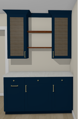 ltra realistic photograph of a custom residential bar area bespoke deep navy built in cabinetry with a smooth satin finish lower base cabinets topped with a light stone countertop upper wall cabinets with brass metal mesh cabinet fronts finely woven with subtle transparency warm metallic reflections and slim brushed brass hardware two floating red oak shelves centered between the cabinets rich reddish brown tone with visible wood grain and natural edge detail soft neutral wall color clean architectural lines premium millwork with tight joinery balanced ambient and accent lighting highlighting the oak shelves and metallic mesh texture professional interior photography full frame dslr 40mm lens f 4 global illumination ray traced lighting accurate reflections realistic shadows depth of field ultra high resolution magazine quality realism natural color grading