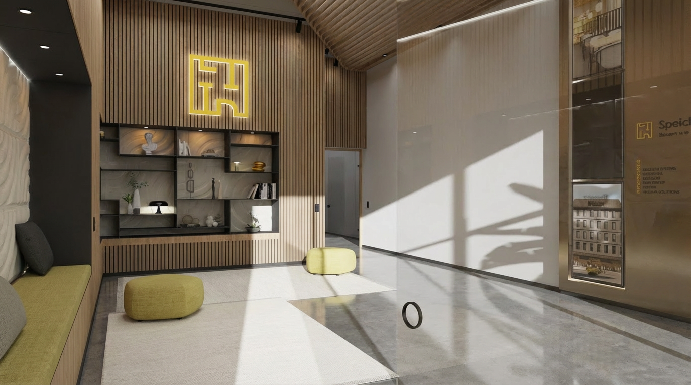 contemporary scandinavian kitchen with travertine and medium oak prompt high definition 3d visualization of the contemporary kitchen and dining space from image 0 png viewed from the same perspective the wooden cabinetry and the rounded corner storage unit are made of rich medium tone oak featuring a tactile vertical grain exactly as depicted the kitchen countertops the entire waterfall island dining table base and the textured backsplash walls are clad in a warm toned honed travertine stone showcasing its natural pitted texture and tonal variations the specific geometric patterned grey and white floor tiles from image 0 png are accurately rendered extending across the floor the iconic linear multi arc pendant light from image 1 png and image 2 png in its distinct warm coral orange terracotta color with its complex coiled and straight hanging wires hangs centrally over the dining table the round top wood dining table is joined to the travertine island flanked by the four blue and mint upholstered chairs with copper legs from image 0 png all appliances the stacked black ovens and the wine cooler on the right are clearly visible and integrated the decorative floating wooden shelves with the succulent black glass jars and oil bottle are precisely in place the left side wall with the door is light grey textured plaster the scene is bathed in a soft natural diffused daylight coming from an off screen window creating soft shadows and highlighting the deep tactile textures of the travertine and oak grain the overall atmosphere is warm inviting and architecturally detailed with clean lines and no clutter