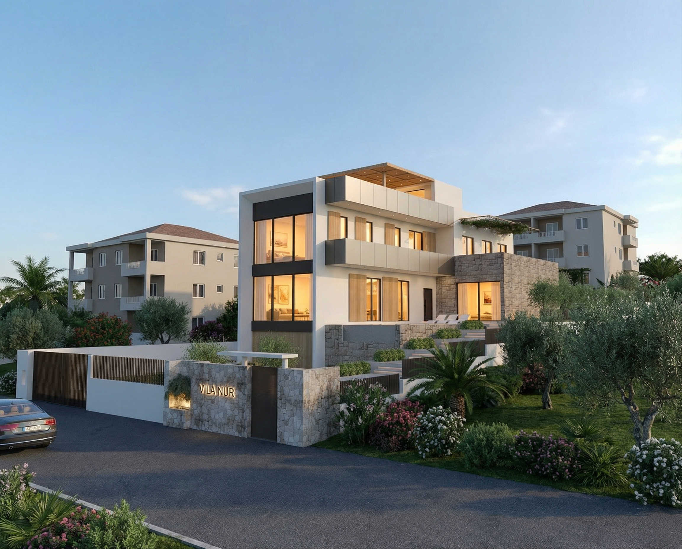 i want to turn this sketch overlay into a building design the red lines will be a new gym building the greean lines will be a plaza in front of the building the blue lines will be a parking lot with cars parked in rows the rows will run parrallel to the buidling and the black lines is an black picket fence