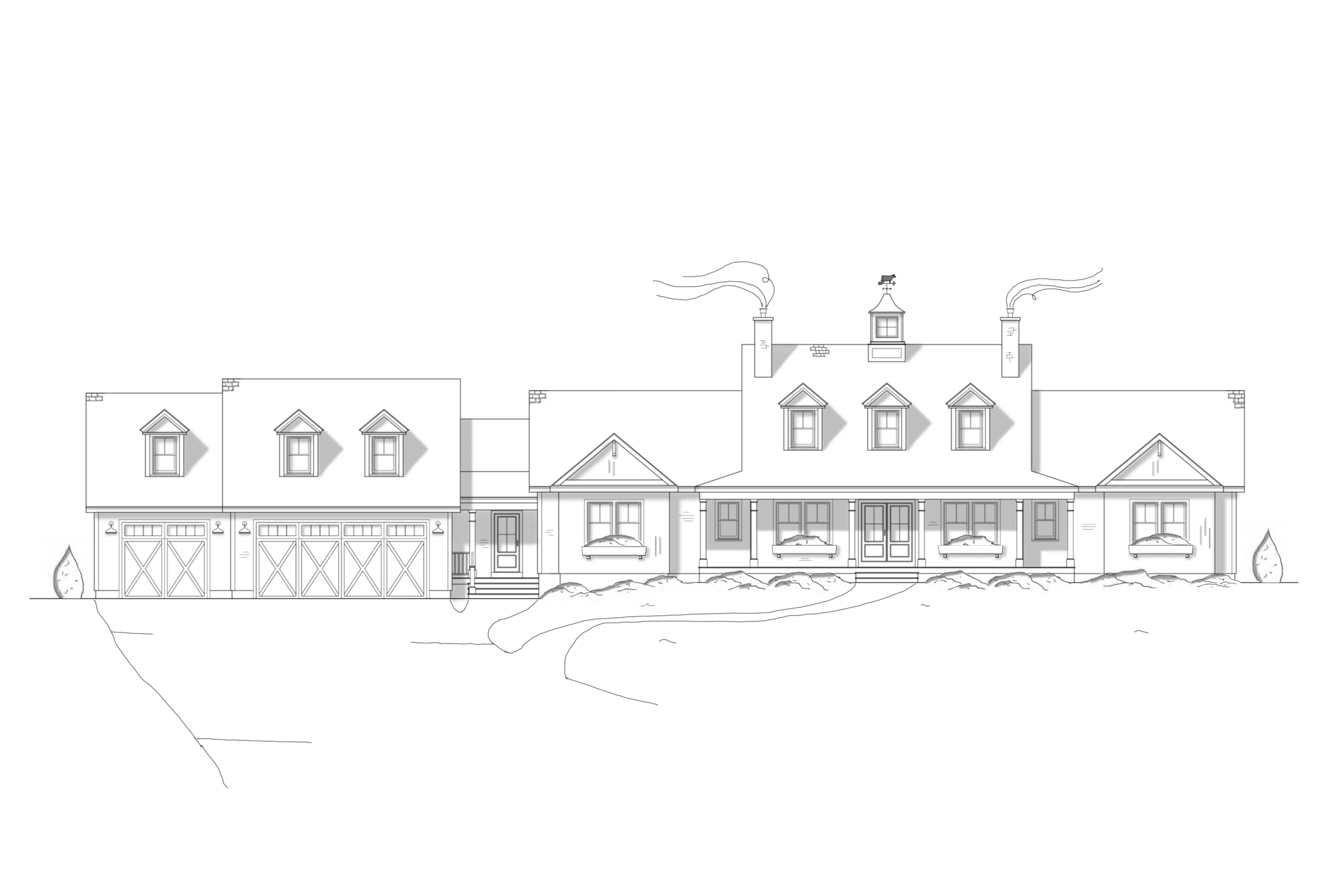 create a photoreal image modern farmhouse with white siding black windows black asphalt shingle roof wood tone doors flower boxes under windows put the garage at a 45 degree angle