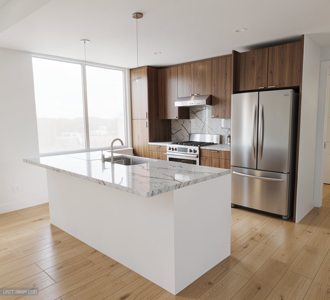 render this kitchen with 1 cabinets to be shaker style in a cool medium walnut hardware to be stainless steel and fixture and appliance finishes to be stainless steel 2 flooring to be narrow plank light oak 3 appliances to be stainless steel 4 quartz countertop with light grey vein 5 quartz backsplash with light grey vein 6 window to have 2 fixed glass lights 7 walls to be painted flat white 8 wall base to be painted glossy white 9 kitchen island to be sheetrock painted white