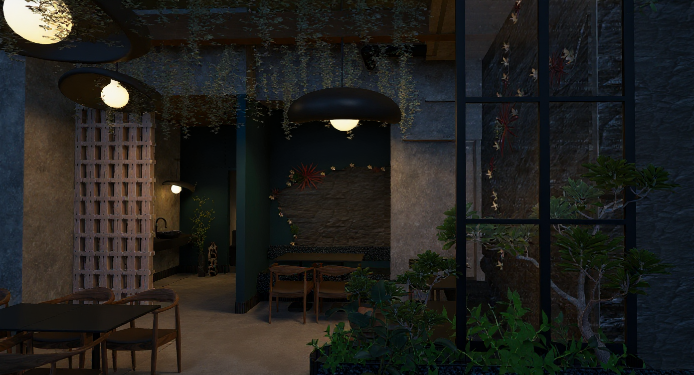 photo realistic rendering with light shining from the right into the lobby california sunny weather withnative landscape and drought tolerant plants