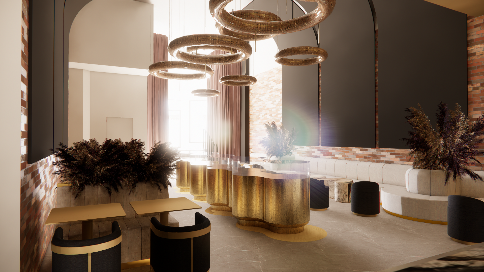 add a sunset on the grey arch curved screen add lighting for a low warm ambient glow on the bottom of furniture