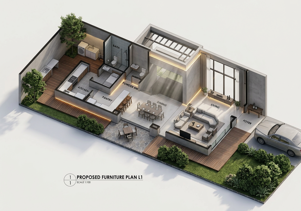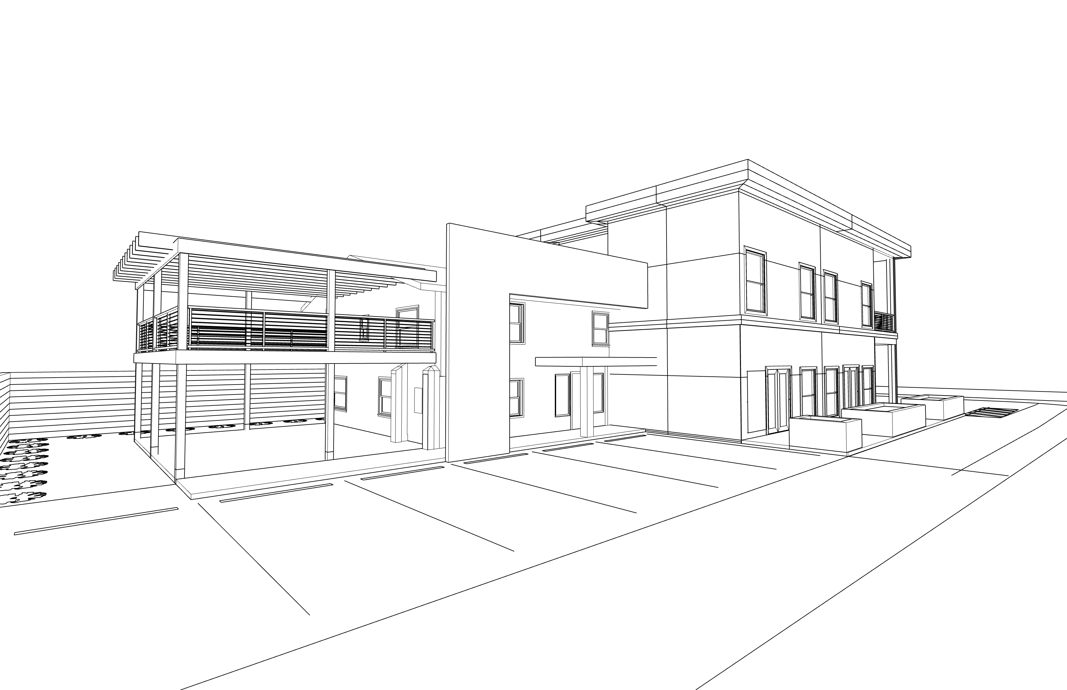 bauhaus exterior shot florida urban setting with palm trees in the background explore the use of contrasts and colors light versus dark grays and wood textures and stone modern stone pavers in unique geometrical forms also create a lush tropical landscaping around the building to complement florida contemporary modern architecture the building is located on a urban street with cars traffic show sidewalk and street road architecture