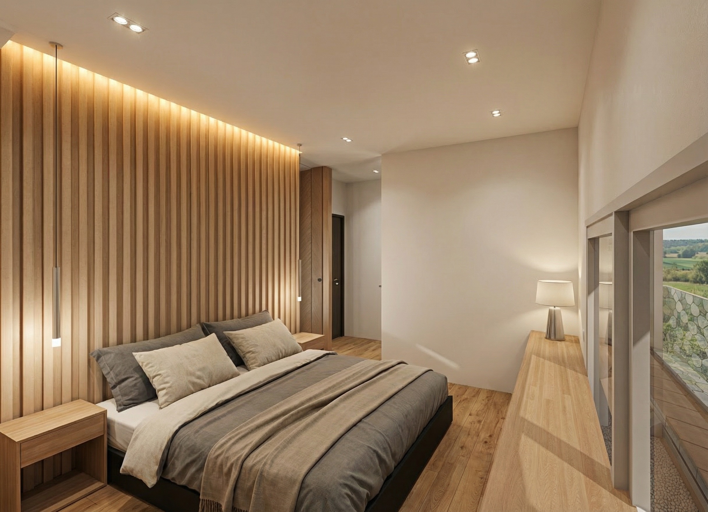 make a cove lighting in the wood wall behind make the floor tiled concrete