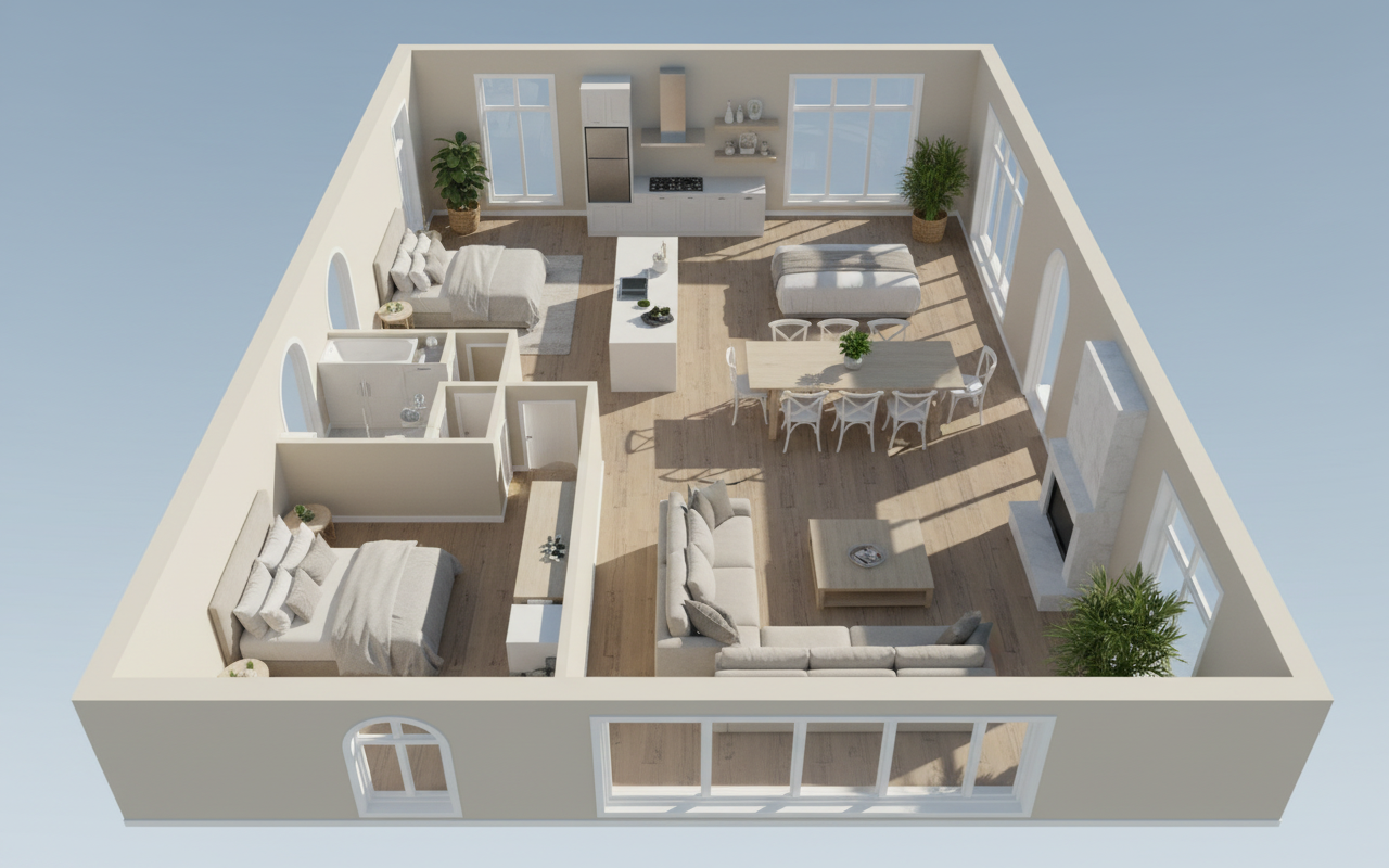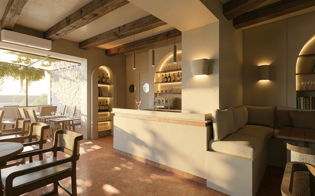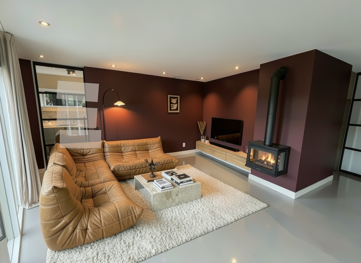 make a realistic appartment terrace with warmer daylight realistic subtile reflection of city hasselt pouf and one pillow are in brown velvet for the other two pillows keep the color and texture flower pots in anthracite with texture keep everything as it is