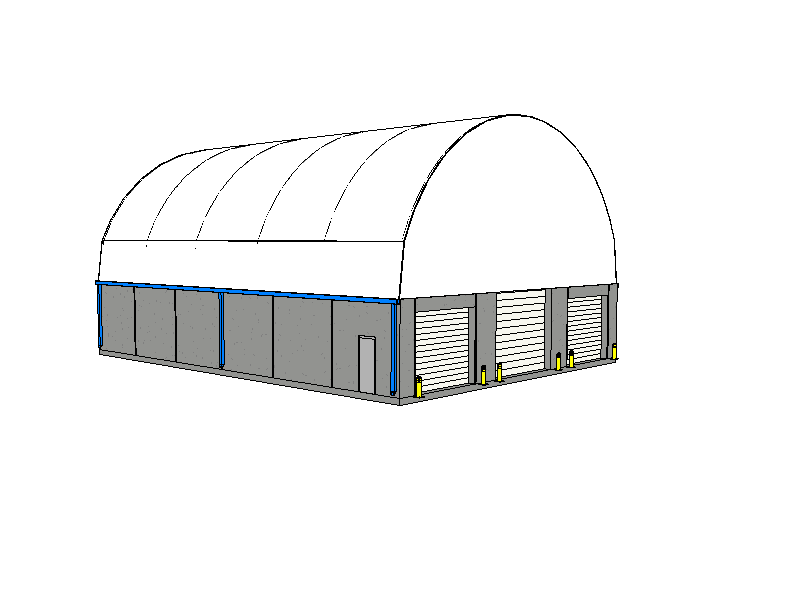 modernist exterior shot a modern warehouse with a dome shaped roof illuminated in vibrant colors the main structure is concrete gray with sleek blue accents on the edges and doors the dome is a pristine white reflecting sunlight for a serene glow the garage doors are a soft beige contrasting subtly with the gray walls the setting is a sunny day with a clear blue sky overhead casting soft shadows around the building creating a calm and vibrant industrial atmosphere architecture