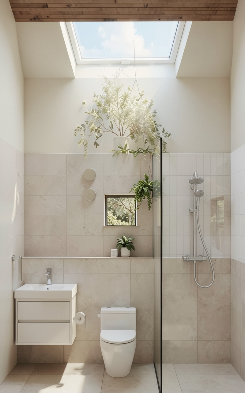 show vanity in timber oak look with grey bench white basins black bench mount mixer taps and grey floor and wall tiles add decor and lighting make mirror an led mirror add a toilet to the right of the vanity