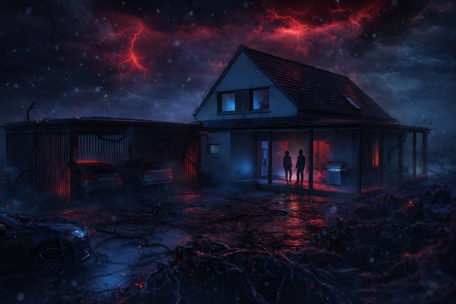 render a modern house in a serene suburban setting under a clear blue sky the house is painted in sleek white with a contrasting dark gray roof the wood elements like the carport and window frames have a natural weathered texture in light brown surrounding the house is a lush well manicured green lawn with a smooth concrete driveway the atmosphere is peaceful and inviting capturing the elegance and simplicity of contemporary architecture during a bright sunny day