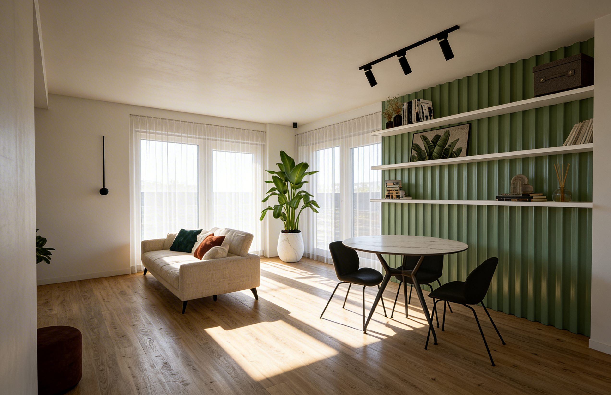 add a festively laid luxurious wooden dining table for 6 people in one line with lighting with luxurious designer chairs using white leather for the seat slide the built in wardrobe on the right 1 m back reduce the height of the image above the sofa by 40 leave the width the same adjust the light in the view on the terrace change the background to bright sunlight in line with the light entering the interior from the left