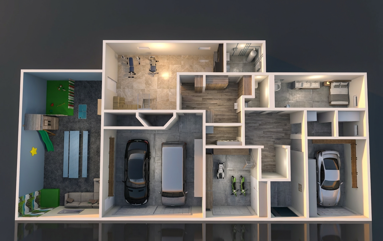 genau dieses rendering berarbeiten fotorealistisches innenraum foto exakt dieselbe perspektive und kameraposition wie das hochgeladene referenzbild 100 identische raumgeometrie exakt gleiche m belanordnung exakt gleiche verlegeart und richtung von platten und parket wie vorlage exakt identische fensterpositionen mit gleichem ausblick durch die fenster raum rechts oben ist der waschraum mit grauem plattenbelag wie die garage fitnessraum hat beigen plattenbelag aus marmor kleiner technikraum oben hat grauer plattenbelag wie die garage die garage links hat ebenfalls grauer plattenbelag das grosse spielzimmer auf der linken seite hat einen dunkelgrauen teppich alle r ume mit parkett sind vergrauter parkett hellgraubraun weiches nat rliches tageslicht leicht schr g einfallende sonne durch die grossen fenster zus tzlich alle r ume k nstlich hell ausleuchten sanfte realistische schatten blickrichtung ist nach norden sonnenlicht kommt von s den deckenbeleuchtungen in den r umen anbringen realistische materialien echte holztexturen stoff mit leichten gebrauchsspuren hochwertige oberfl chenreflexionen alle m bel ersetzen mit designerm bel alle autos ersetzen mit echten autos ganzer grundriss freistellen und hintergrund anthrazit nat rliche farbwiedergabe leicht warme farbstimmung golden hour feeling das bild muss wie eine professionelle fotografie aussehen es soll ein echtes und reales foto sein canon eos r5 35 mm festbrennweite f 2 8 hyperrealistisch dslr qualit t raw aufnahme 8k aufl sung extrem scharf perfekte tiefensch rfe professionelle architekturfotografie