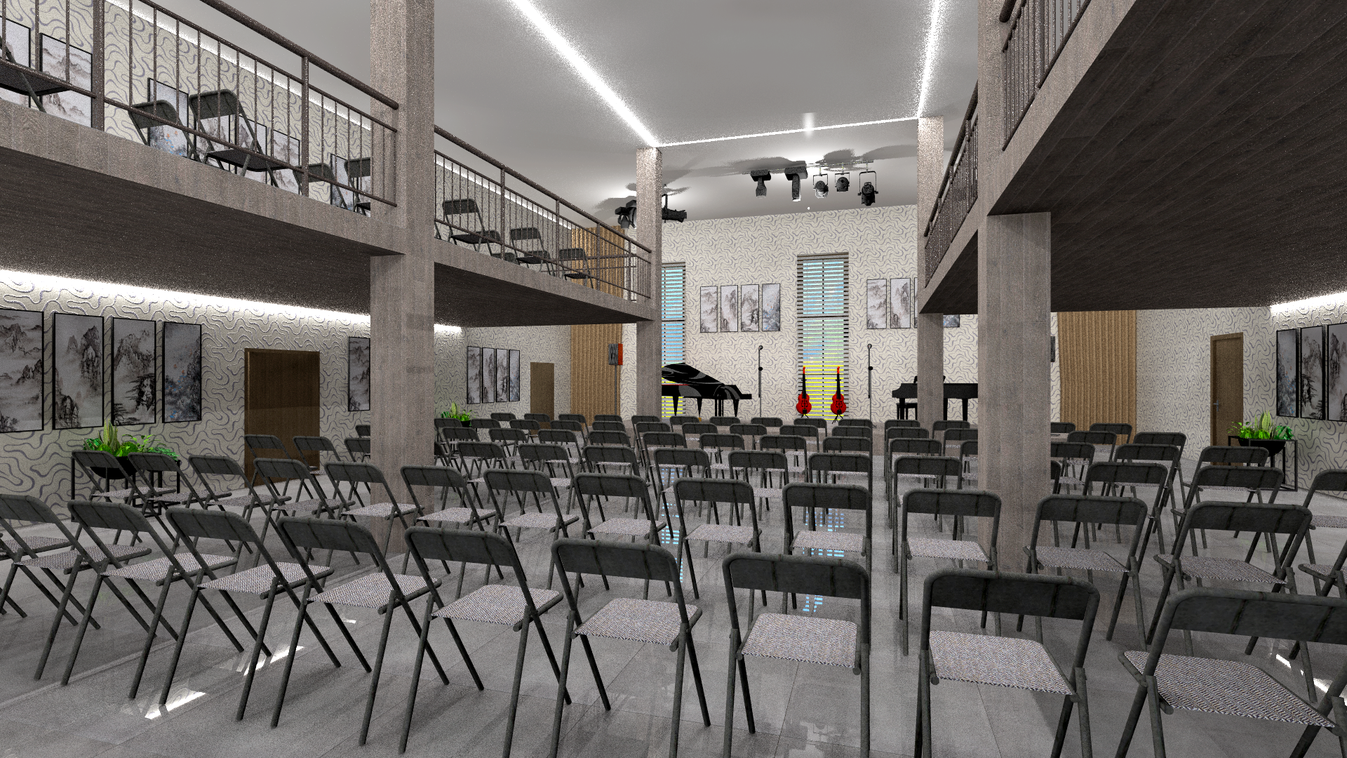 a spacious modern conference hall with a mezzanine design the atmosphere is airy and welcoming with ample natural light streaming through large glass windows the ceiling has elegant subtle lines of led lights providing a soft glow the walls feature abstract wave patterned wallpaper in muted blue and cream tones the flooring is polished gray marble reflecting light subtly chairs are arranged in neat rows in a sleek black color green plants in black pots add a touch of nature while the artwork on the walls showcases delicate landscapes in grayscale the overall ambiance is professional and serene perfect for events or gatherings