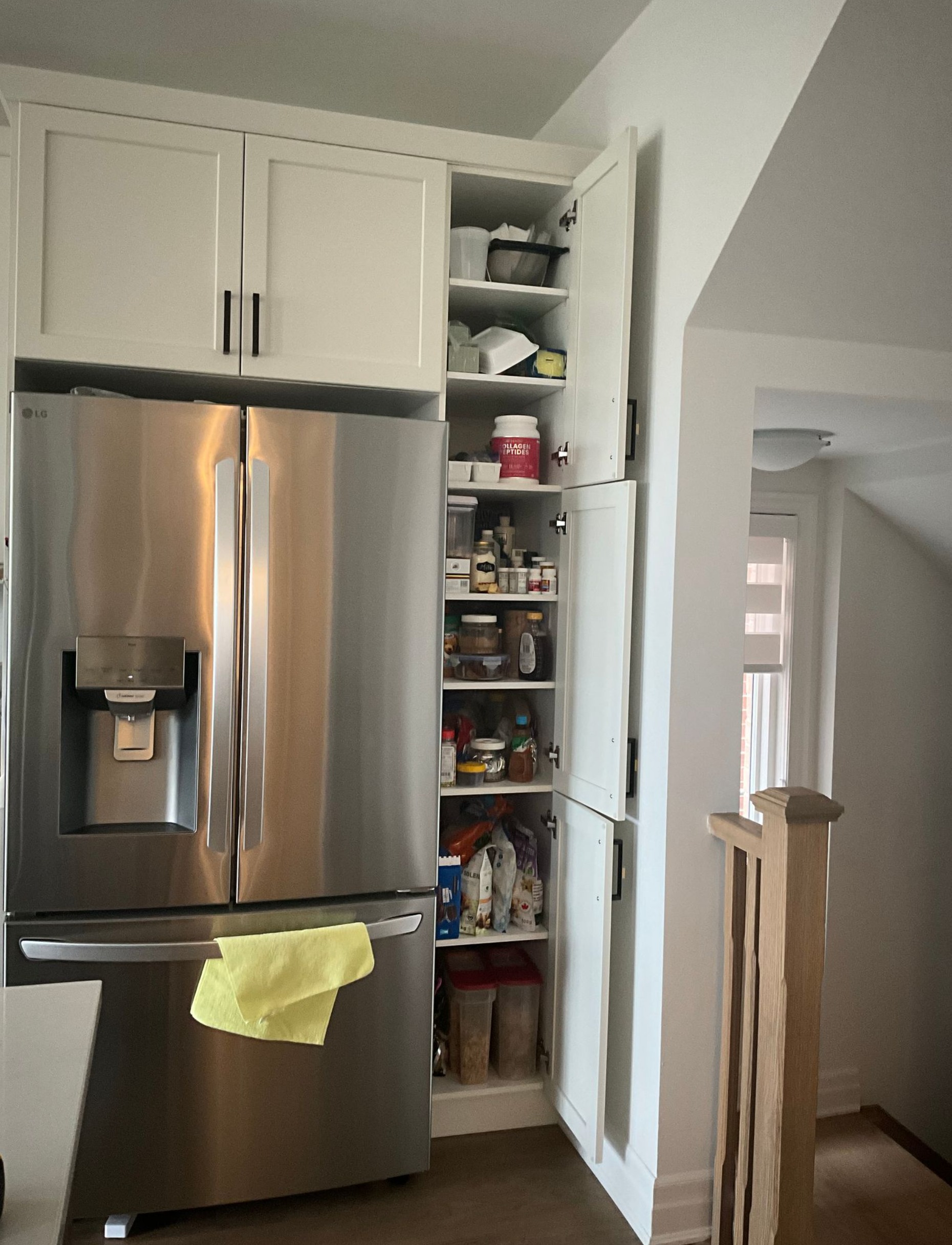 add pullouts like the example in the shelved pantry make sure they have a buildout to miss the hinge and door make sure they are constructed from the same shelf material and remove the adjustable shelves pullouts 2 x 6 high in the bottom sections and 6 x 3 high in the above 6 sections put the stuff from the shelves in the pullouts