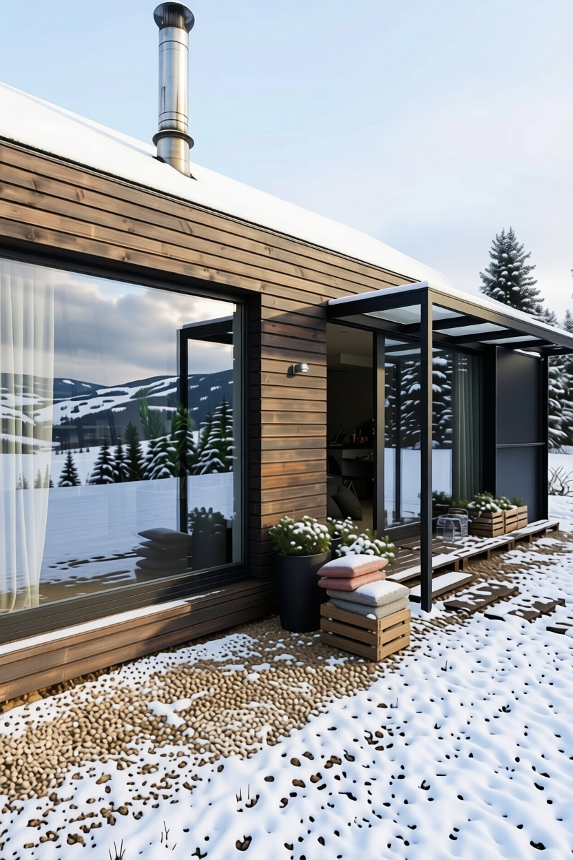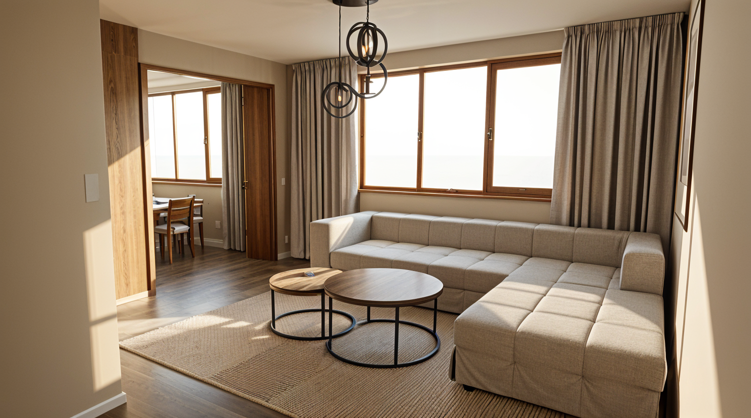 a modern luxurious kitchen with a serene and sophisticated atmosphere the room features sleek grey oak cabinetry with flutted travertine curved cabinets and a large island centerpiece made natural traavertine romano the walls are clad in a soft cashmere hue with panelling complementing the cabinetry appliances are seamlessly integrated adding a touch of contrast overhead lighting is warm and ambient creating a cozy yet refined ambiance the flooring is parquet enhancing the airy feel of the space sparse greenery adds a hint of freshness while maintaining the minimalistic and clean design outdoor light from the right hand side window view is of luxury villa style