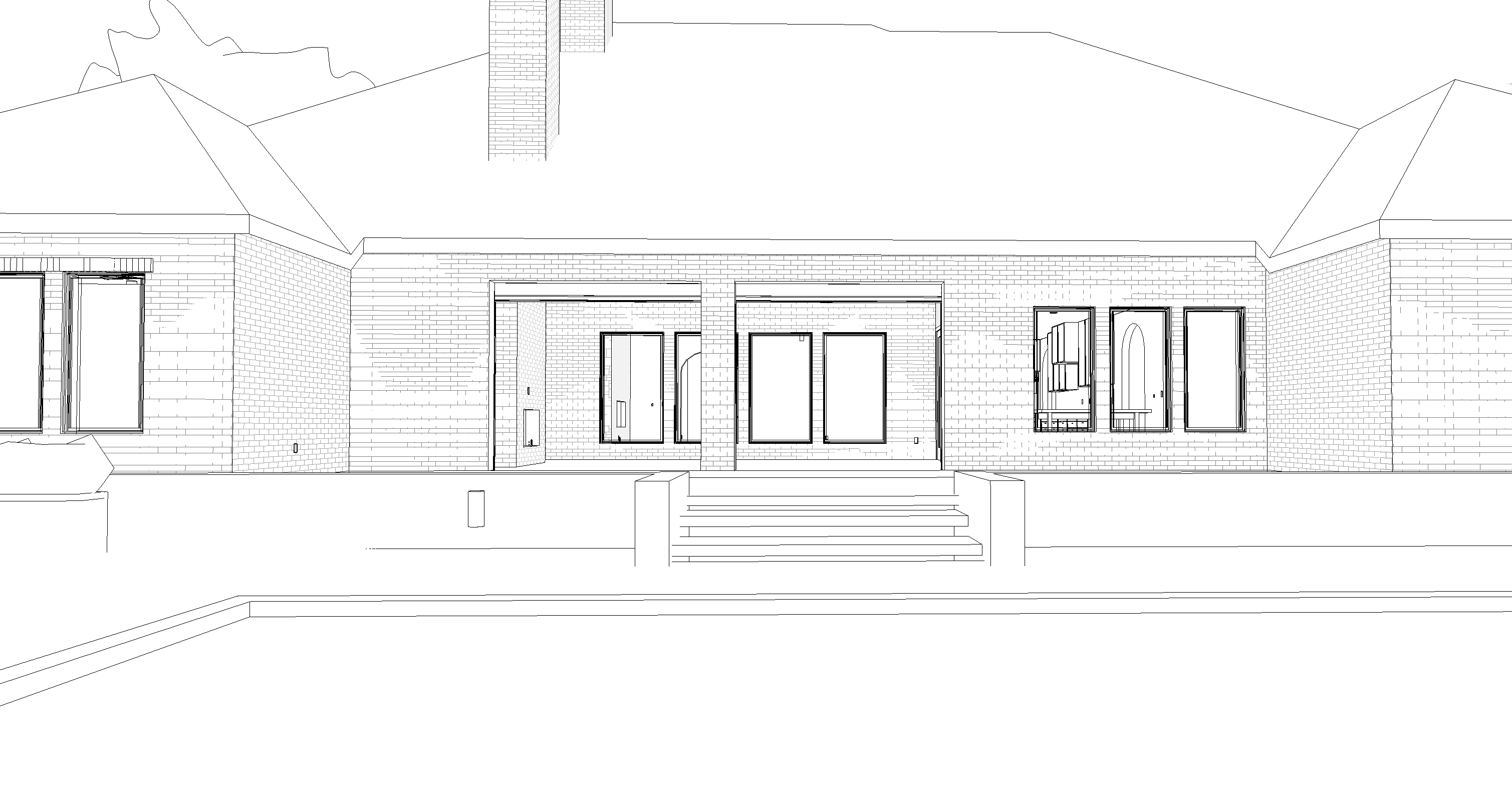 dark red and brown bricks black windows black roof black trim travertine retaining wall and deck over casted day warm lights wet deck