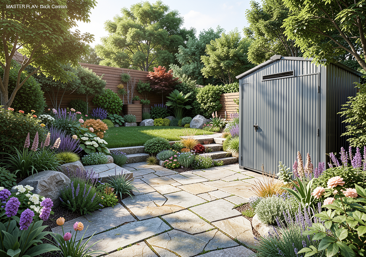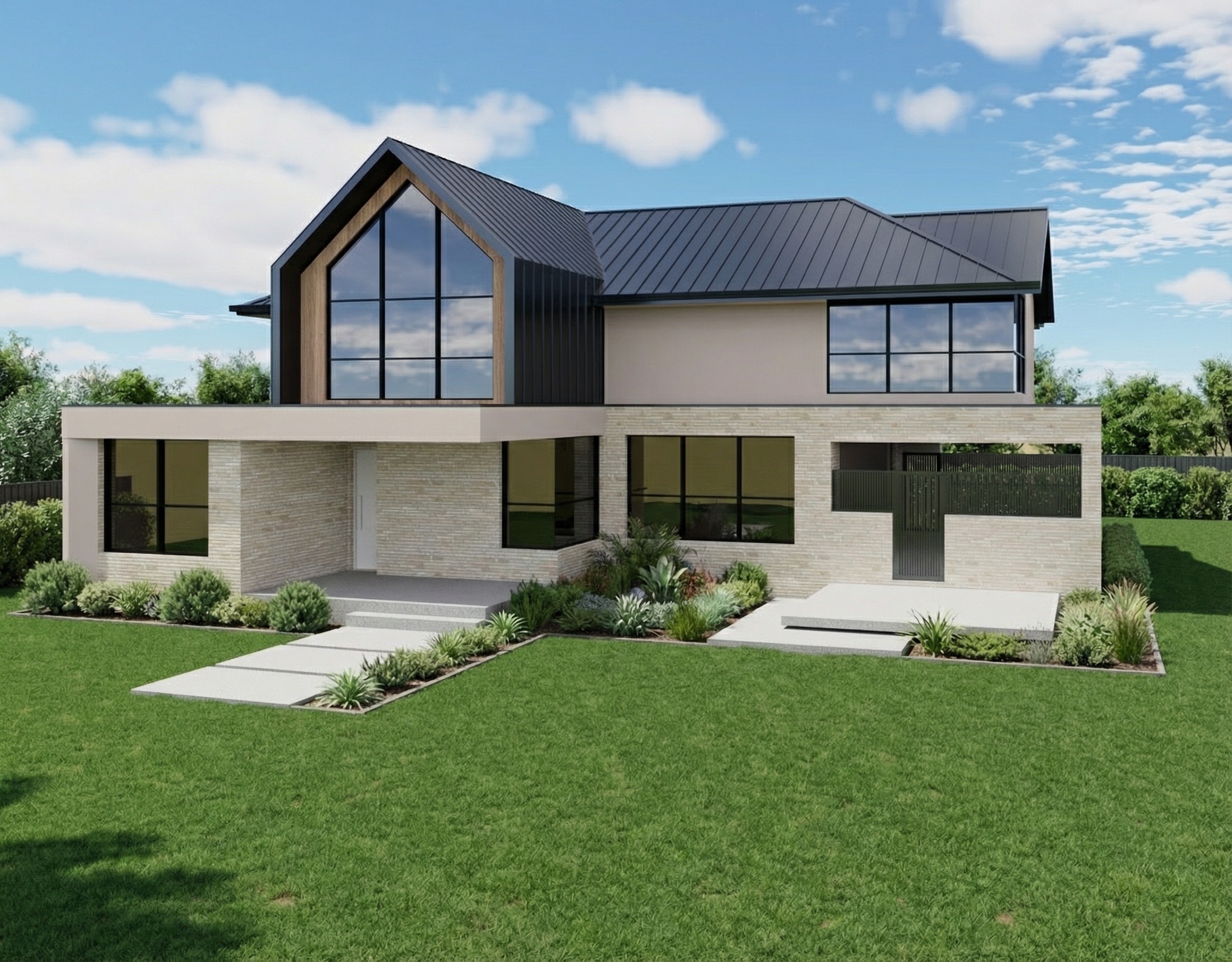 improve the landscaping garden and material quality of this image there is a street road to the right edge of screen naturally input this cinematic and realistic look natural lighting