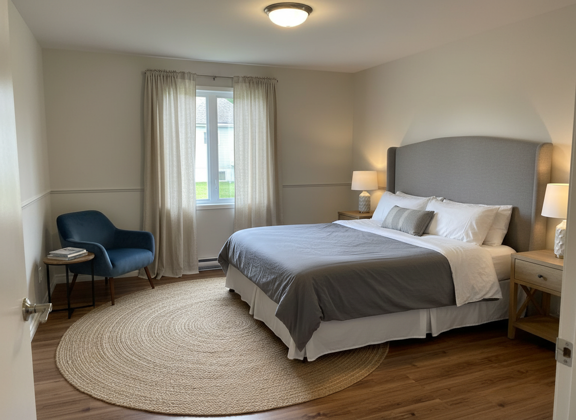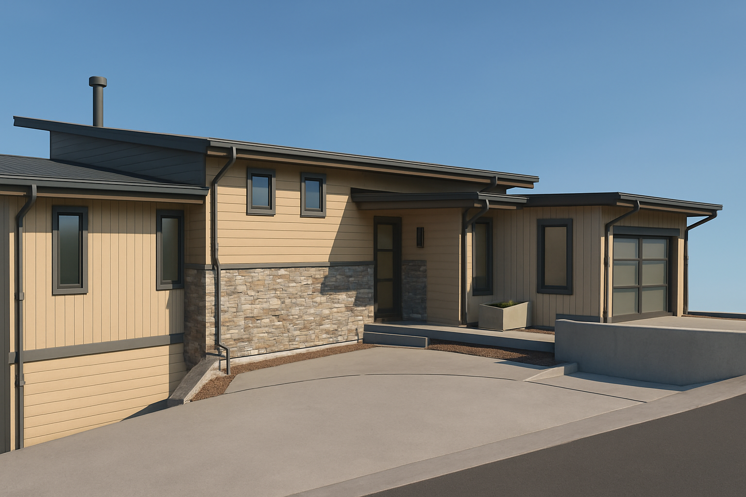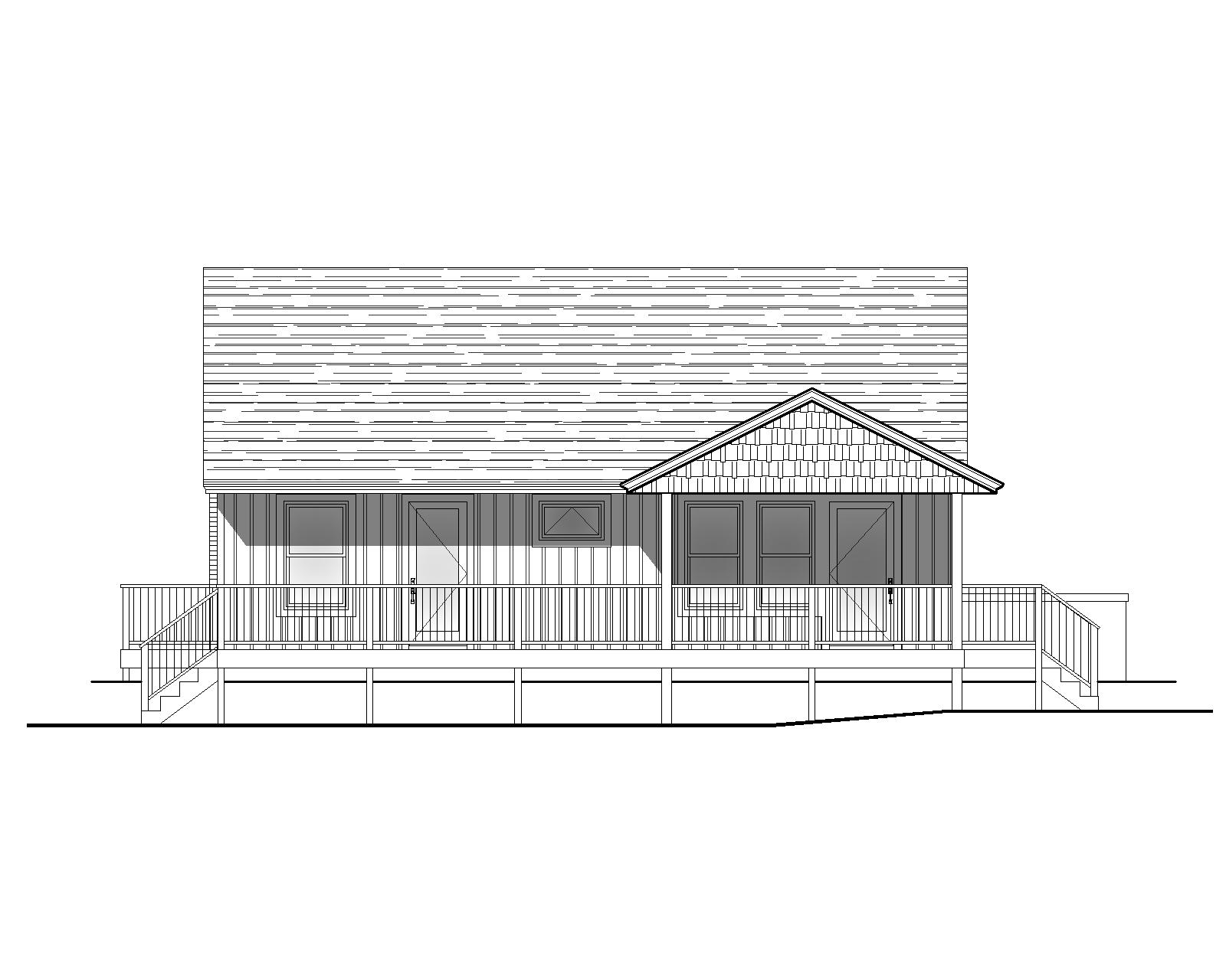 make a photo realistic rendering of this rear of this house provide nice landscaping and a bright summer sky there is a deep covered porch on the rear of the house for relaxing shake siding is brown board and batten is sage and trim is bright white