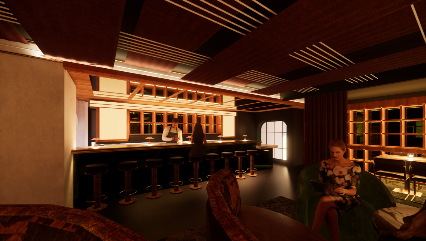 cozy upscale bar interior with a warm atmosphere rich mahogany and deep brown ceiling with geometric light patterns soft ambient lighting highlights a long elegant bar with dark green accents bar stools with textured wooden bases and black cushioned tops arranged neatly a stylish lounge area is furnished with an emerald green couch and a round marble topped table a woman in a floral dress sits at the table creating a tranquil inviting scene the background features a softly lit bookshelf in warm gold tones enhancing the sophisticated intimate setting