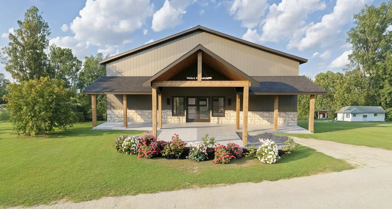 u gravel driveway under carport that connects to a large gravel parking area in front of the building remove the white building in the right corner flower bed in front of the carport with a dark mulch and stone border