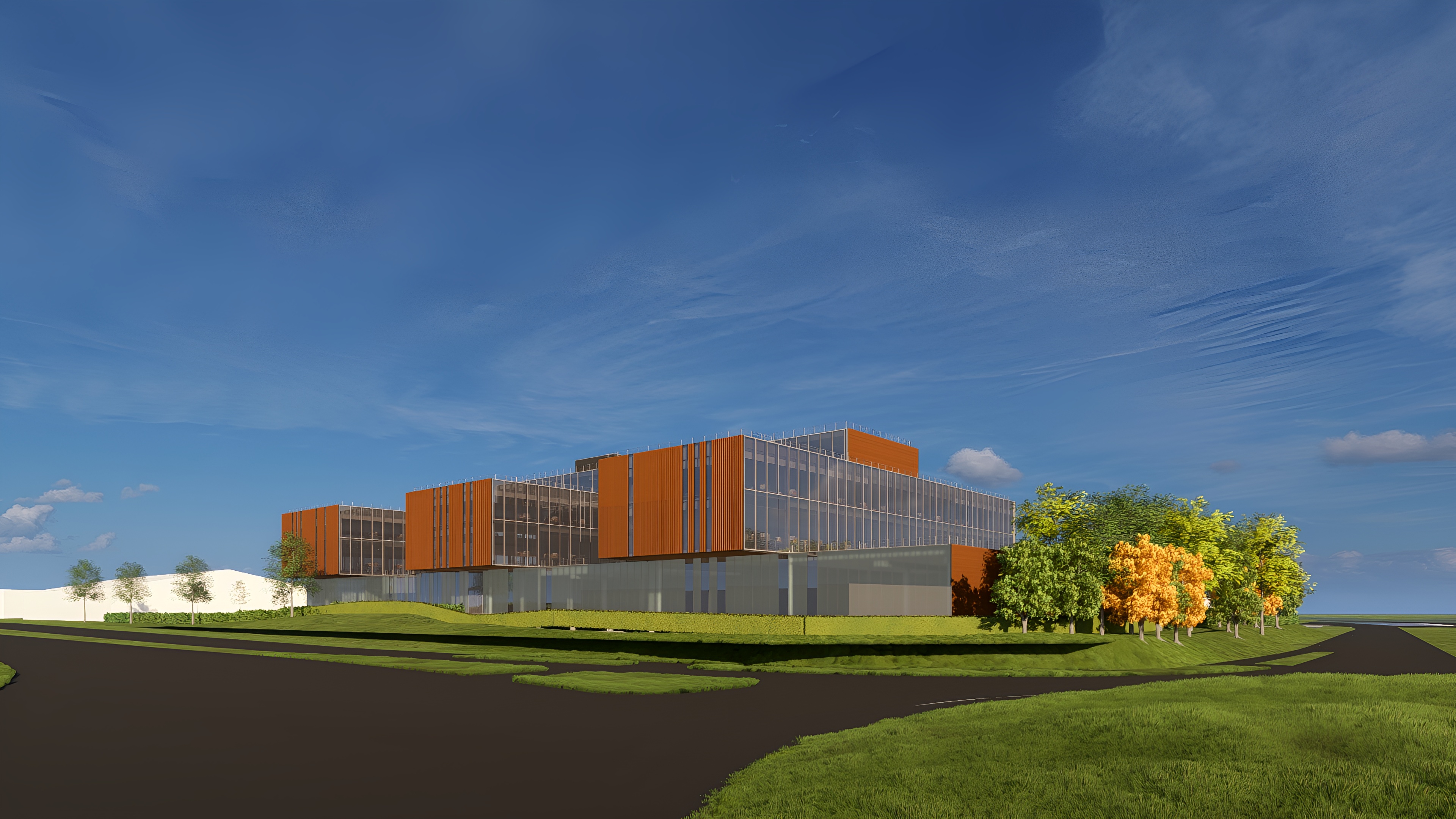 create an ultra realistic rendering while strictly preserving the original architectural form including the exact position of openings and volumes do not alter the structure or the penetrations apply only realistic materials to the surfaces including rust colored brick glass and a translucent polycarbonate base focus on realistic textures without altering the building s geometry