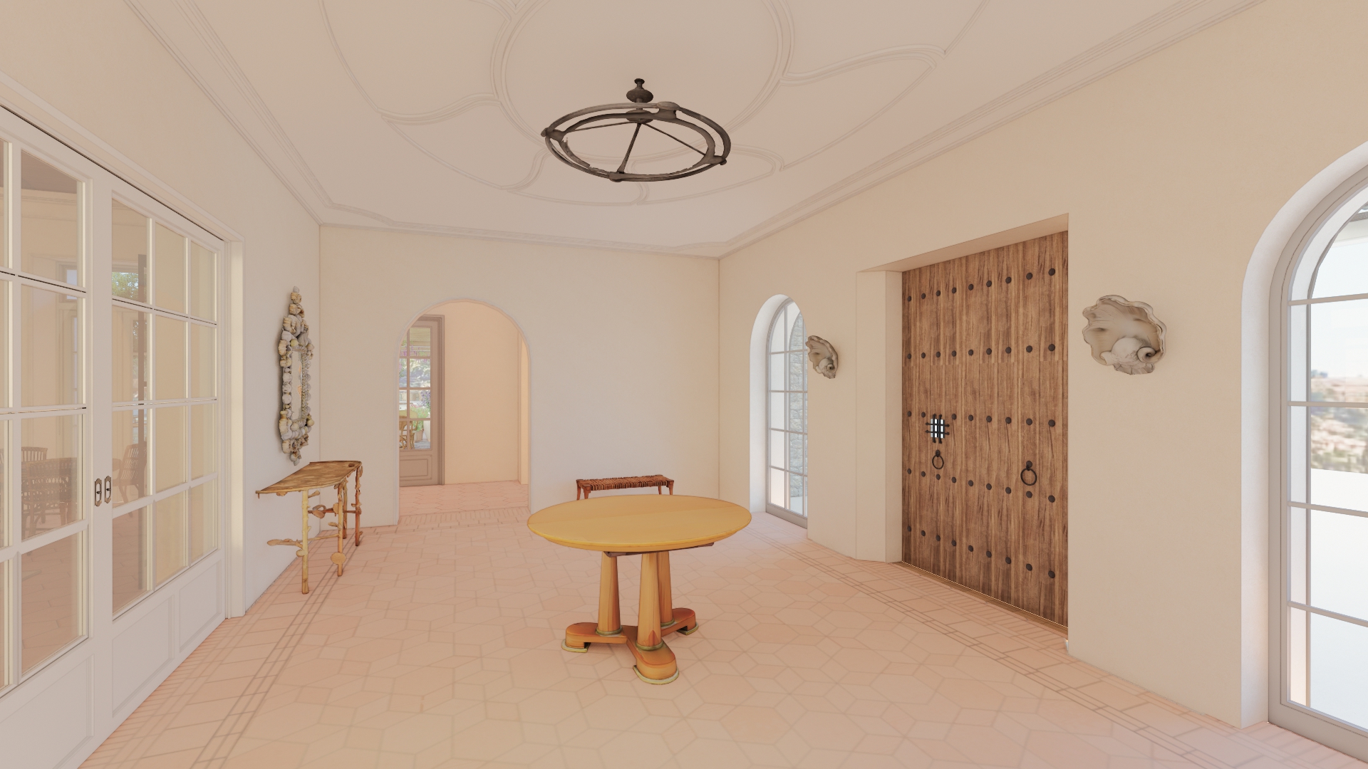 enhance all the details of this rendering and increase the definition add a bouquet of flowers above the table