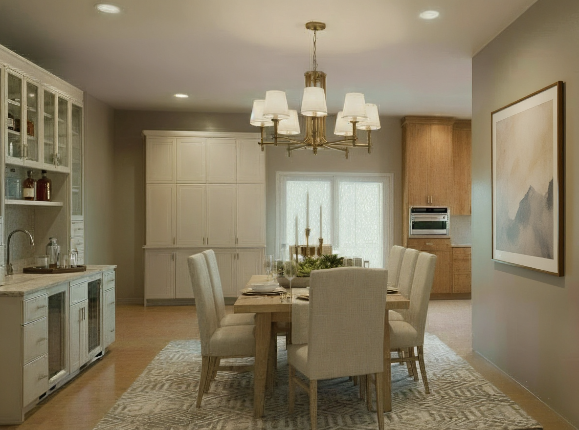 render a minimalist modern office room with a sleek stylish atmosphere use soft beige for the walls to create an open airy feel illuminate the space with warm natural sunlight filtering through large translucent windows along with a curtain a side add a modern electronic drum set in matte black positioned beside a light walnut chair with a charcoal gray table include one mid century modern office chairs with light wooden accents and polished metal bases decorate the walls with black and white landscape photographs use a slightly dark beige carpet to ground the space ensure the lighting creates a calm productive environment