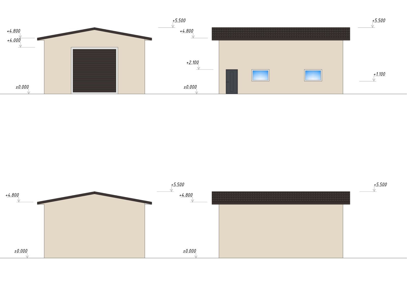 render a modern warehouse exterior featuring a front and side view the structure should have beige walls a dark brown metal roof and a large front garage door in dark brown include two windows with a reflective blue tint on the side the atmosphere is serene and minimalist set against a clear blue sky with soft sunlight casting gentle shadows