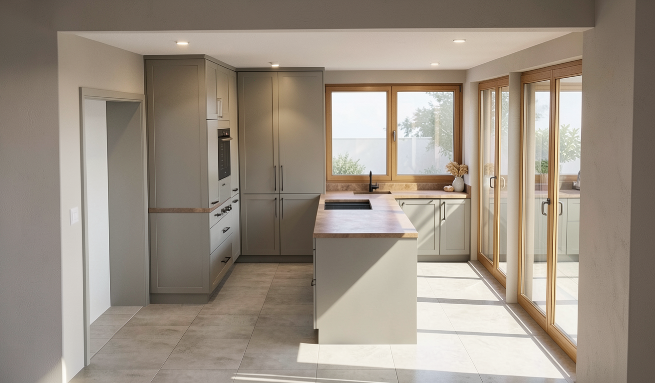 keep all colours and materials the same kitchen cabinets have a glossy finish keep decor in the same placements and do not add any more on the worktop