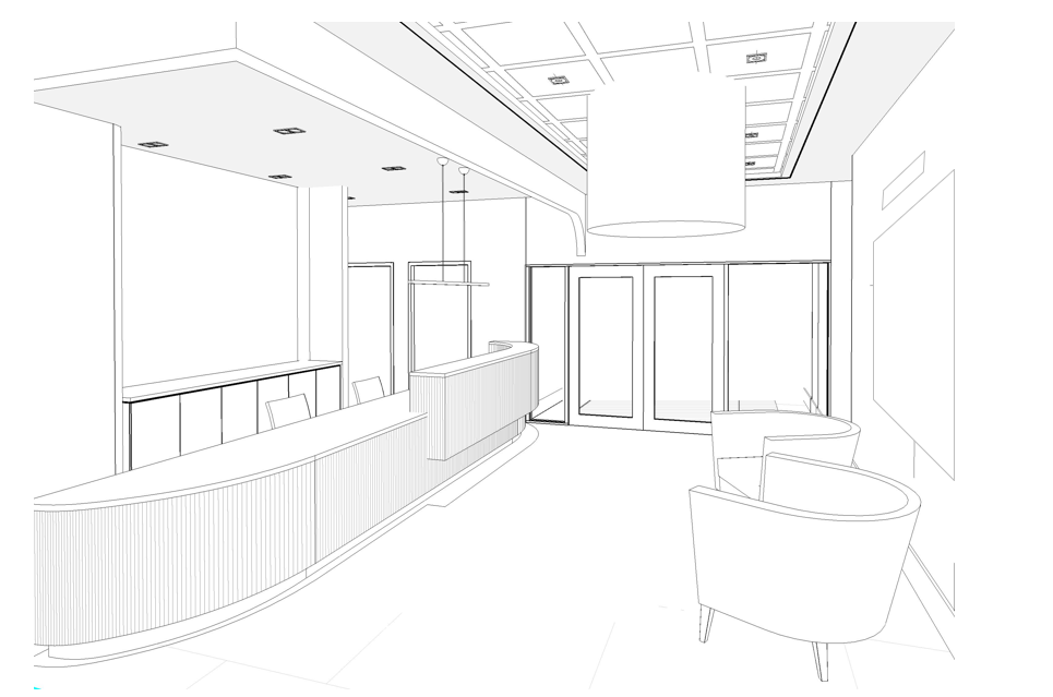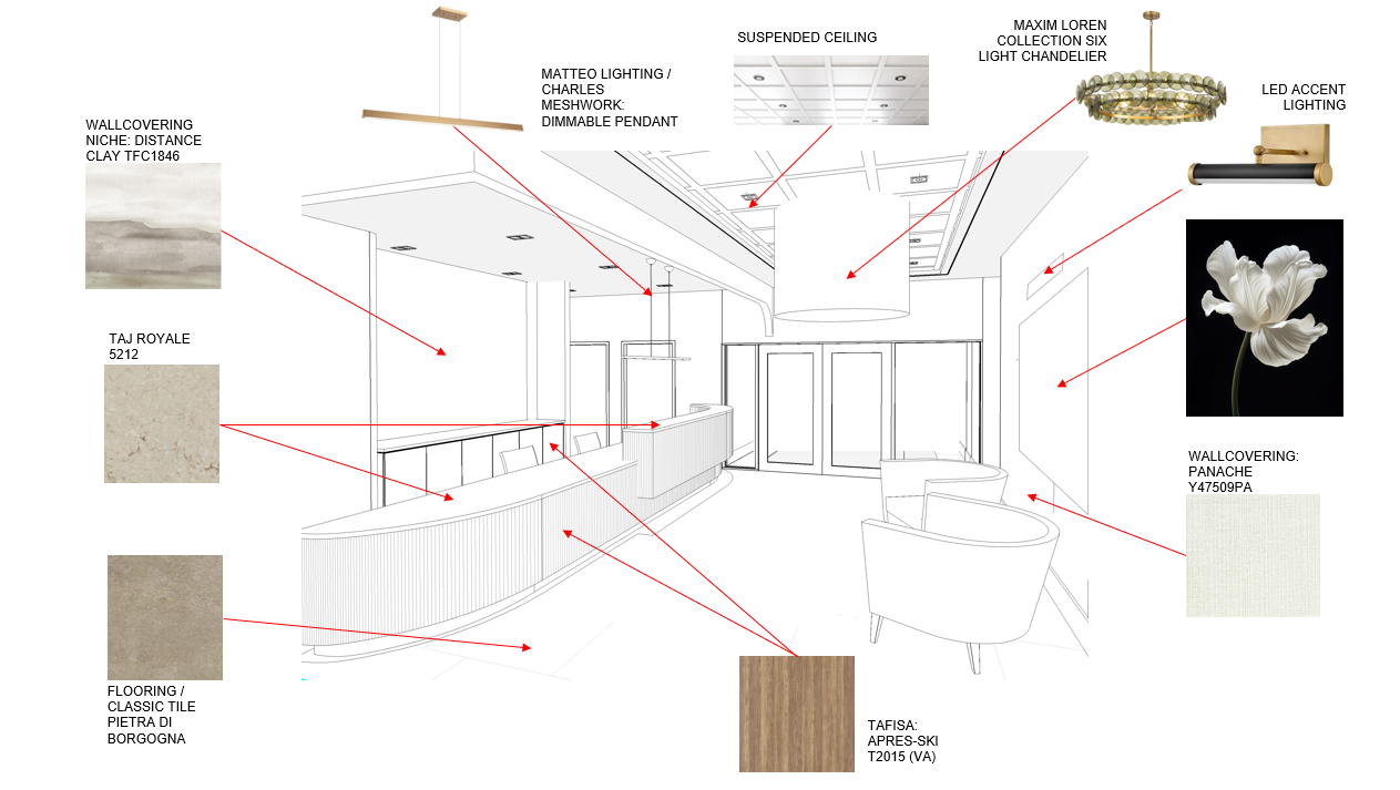 exterior shot this interior design concept blends natural elegance with contemporary sophistication creating a warm and welcoming environment the flooring features classic tile in pietra di borgogna a neutral stone look surface that grounds the space in soft earth tones the reception desk incorporates tafisa apres ski woodgrain laminate adding texture and warmth with a modern linear detail wallcoverings are thoughtfully layered distance clay offers a soft abstract gradient in taupe and grey hues while panache y47509pa introduces a refined woven linen texture for subtle depth counter surfaces in taj royale 5212 add a creamy marble like finish complementing the overall neutral palette lighting is a key design element with dimmable linear pendants by matteo lighting adding modern minimalism and a statement chandelier from the maxim loren collection providing a touch of glamour with its sculptural brass detailing led accent lighting adds functional glow to art and architectural features the suspended ceiling system enhances the clean architectural lines while concealing integrated lighting this design achieves a balance of comfort and professionalism using layered textures organic finishes and curated lighting to define a calm contemporary reception or lobby space