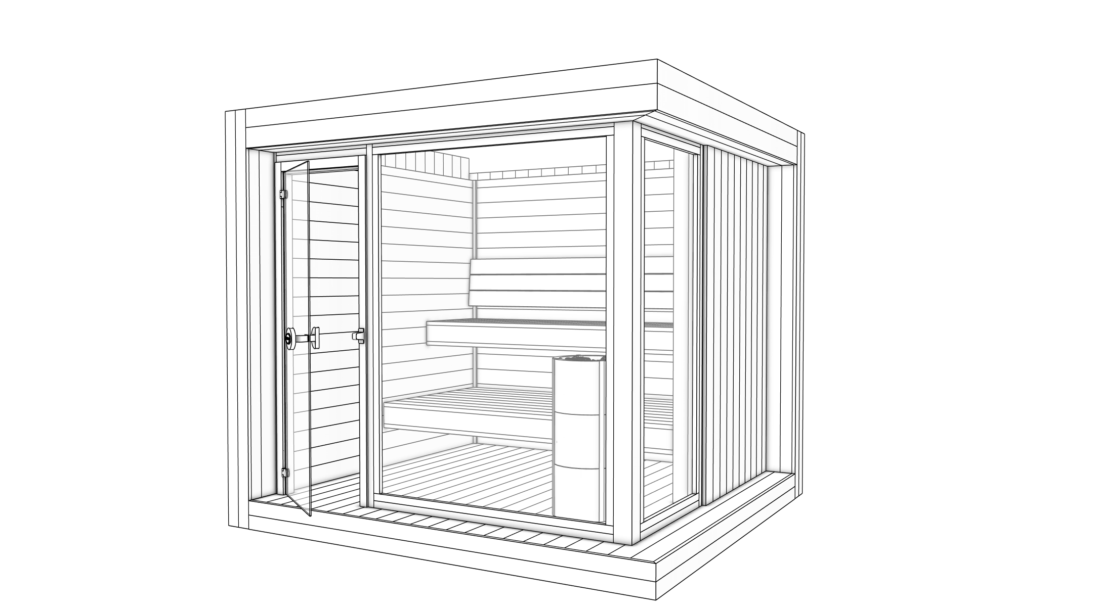 archsynth new clean render start from whitebox only use only the whitebox reference as the base start fresh and do not reuse any look from previous renders keep the sauna geometry 1 1 with the whitebox same openings same corner glass same hinged glass door position same frame thickness same bench layout same roof and base no redesign no extra mullions windows no warping no merged geometry you may improve materials lighting only exterior black charred wood vertical charred wood cladding deep carbon black important keep correct board rhythm with visible seams do not merge multiple boards into one wide plank finish deep matte not shiny fine subtle wood texture refined smooth not rough burnt crust premium craftsmanship frames profiles all visible frames mullions and corner posts around glass are black wood charred wood no visible metal anywhere no aluminum steel chrome keep exact thickness and positions from whitebox glass door glass corner side glass grey tinted smoked clean realistic reflections controlled not mirror interior thermowood walls horizontal boards each board width 120 mm visible seams not smooth panels ceiling must exist wood ceiling indirect led strip along ceiling perimeter edge hidden source warm soft glow benches show plank lines on bench fronts and tops do not turn into one solid slab keep rhythm do not merge into one board wood color warm medium brown thermowood thermo alder smooth premium finish subtle grain heater cylindrical heater in grey soapstone grey stone not white not black clean stone texture lighting mood premium minimal archviz studio render soft controlled highlights realistic contrast keep it clean and modern no overbright hdr negative no sliding doors if the whitebox shows a hinged door no added objects accessories signage no under bench led no extra lighting beyond the ceiling perimeter led no geometry changes no distortions no borrowed elements from earlier renders