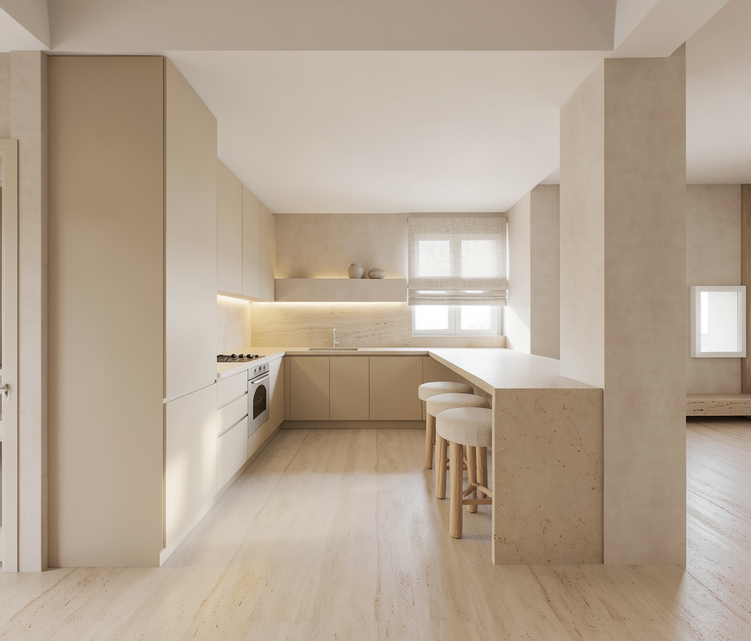 create a highly realistic render of a modern kitchen in a coastal home with a calm warm and refined atmosphere the design is minimal and cohesive inspired by seaside living with a soft neutral palette that evokes natural light sand tones and a relaxed elegance the kitchen layout is linear with an l shaped extension featuring clean handle less cabinetry in a light beige tone with a matte finish the surfaces appear smooth and seamless the countertop and backsplash are in a natural light beige stone reminiscent of sand and coastal textures with subtle variations and a soft matte finish a hidden led strip is installed beneath the upper cabinets providing soft indirect lighting that gently illuminates the backsplash and enhances the warm ambient atmosphere in the foreground there is an extended kitchen island or bar with a monolithic appearance in the same light beige stone material in front of the island there are bar stools with light oak wooden legs and a natural finish the seats are upholstered in a soft light beige linen fabric adding a breathable coastal character at the back a window allows soft natural light to enter the space filtered through a light fabric roman shade in a neutral tone reinforcing the relaxed seaside feeling the walls are finished in light beige microcement and the flooring is in a light natural tone enhancing the airy and serene coastal atmosphere the overall lighting is soft and diffused combining natural light with hidden led lighting creating minimal shadows and a warm inviting high end coastal ambiance ultra realistic render high resolution premium materials coastal interior design interior design magazine photography style the backplash is cemento effect like the walls