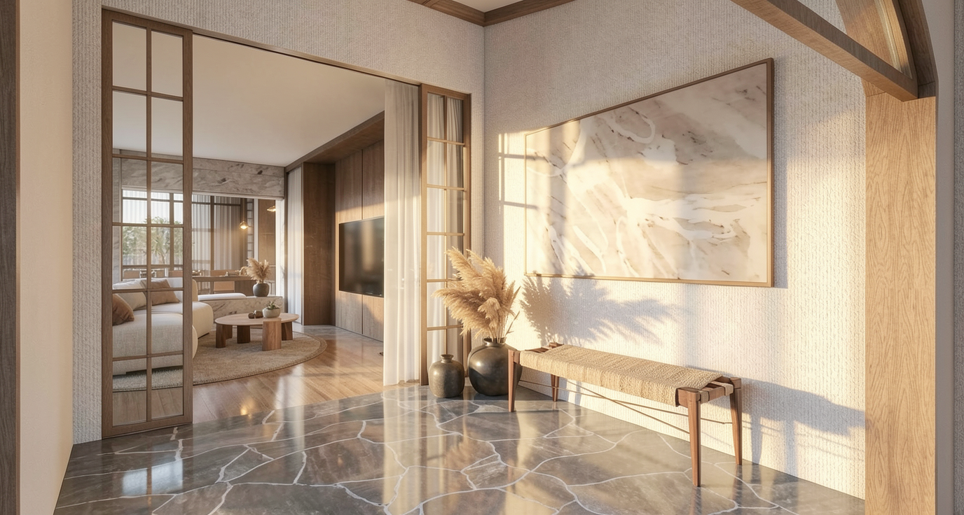 this area is an office lobby add the reception desk under the orange ceiling include people and add lighting