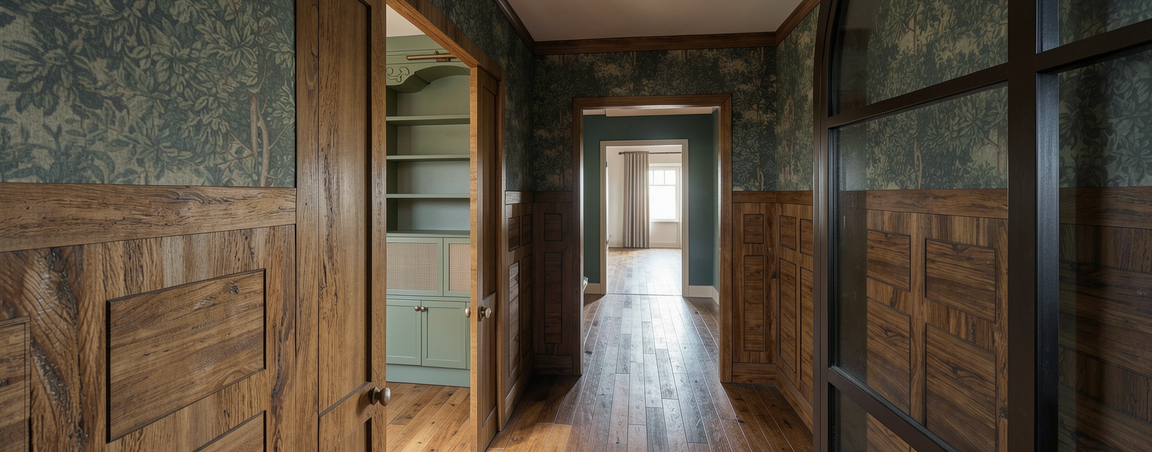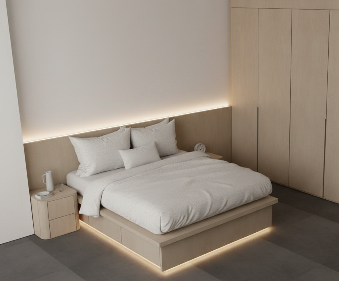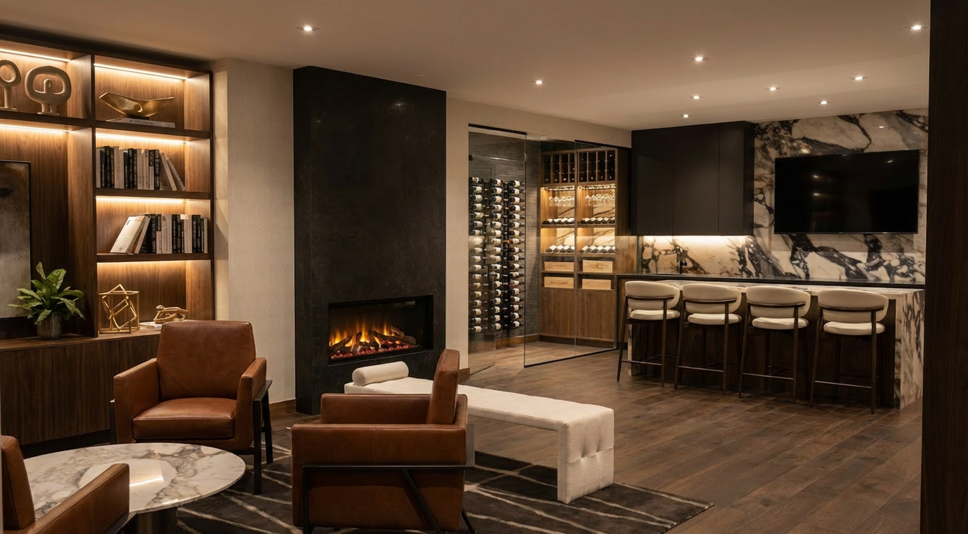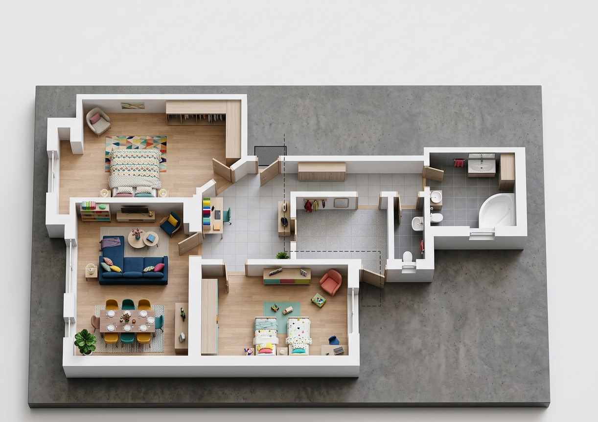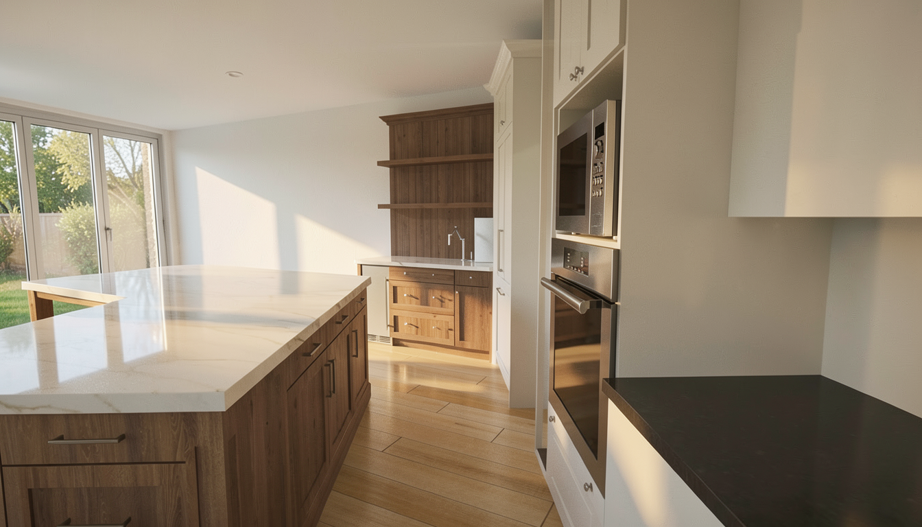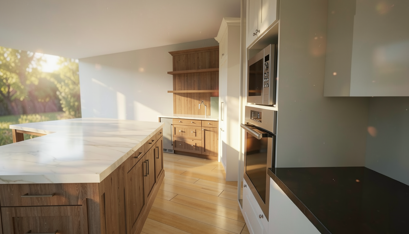 use the right side images as the design reference and apply them to the left side space transform the unfinished room on the left into a completed kitchen using the cabinetry layout materials and style shown on the right align the design so that the northside and southside correspond correctly to the labeled sides in the left image maintain the exact room dimensions structure and perspective of the left image while replacing finishes cabinetry and fixtures to match the reference