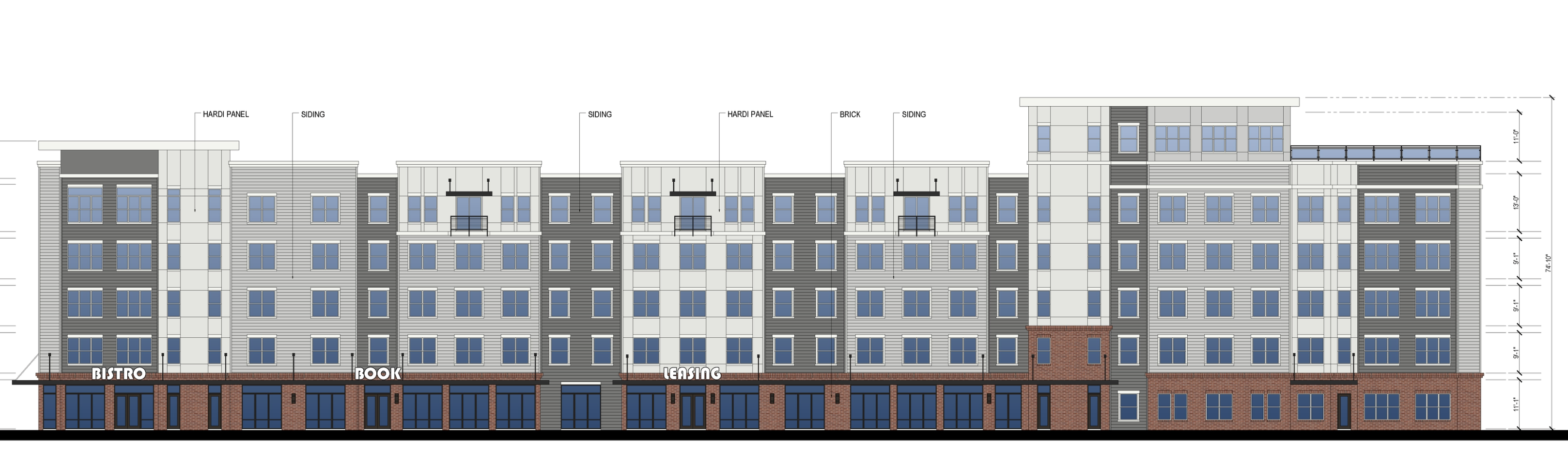 render a modern contemporary apartment building change all the colors of brick and siding to make it feel upscale and timeless make it bold give it a warm ambiance