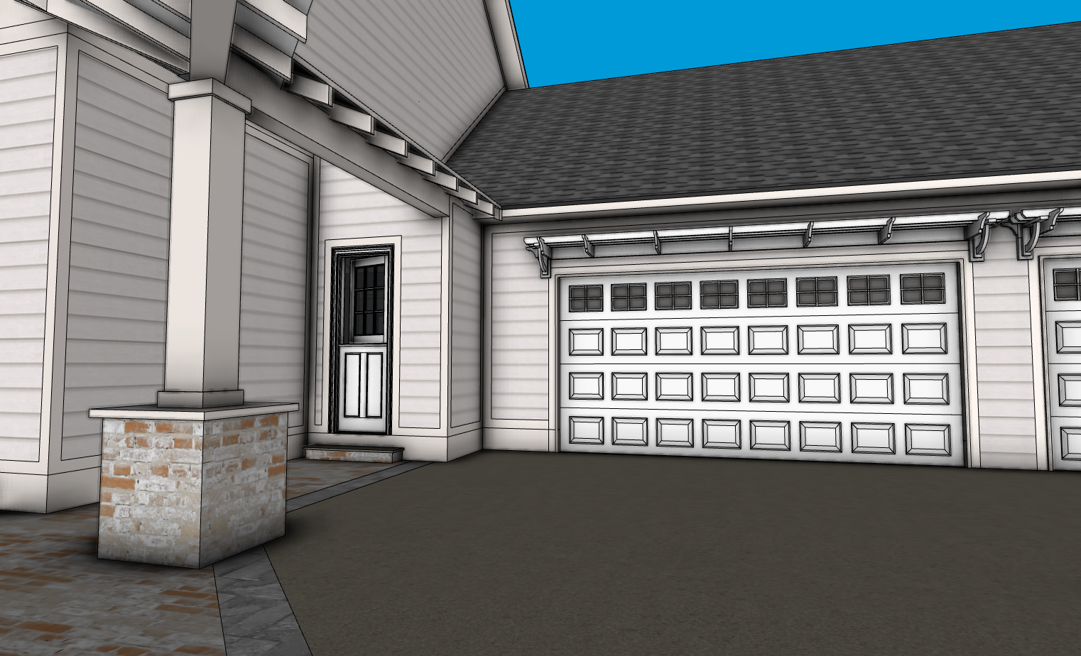 exterior shot generate a porch with a white dutch door and a garage door outside of it with a eyebrow pergola above column should have a brick wainscot siding should be a light oyster color and dark gray shingle roof ground should be a concrete driveway with some brick pavers under the porch have a cheerful atmosphere that showcases a dreamy suburban life architecture