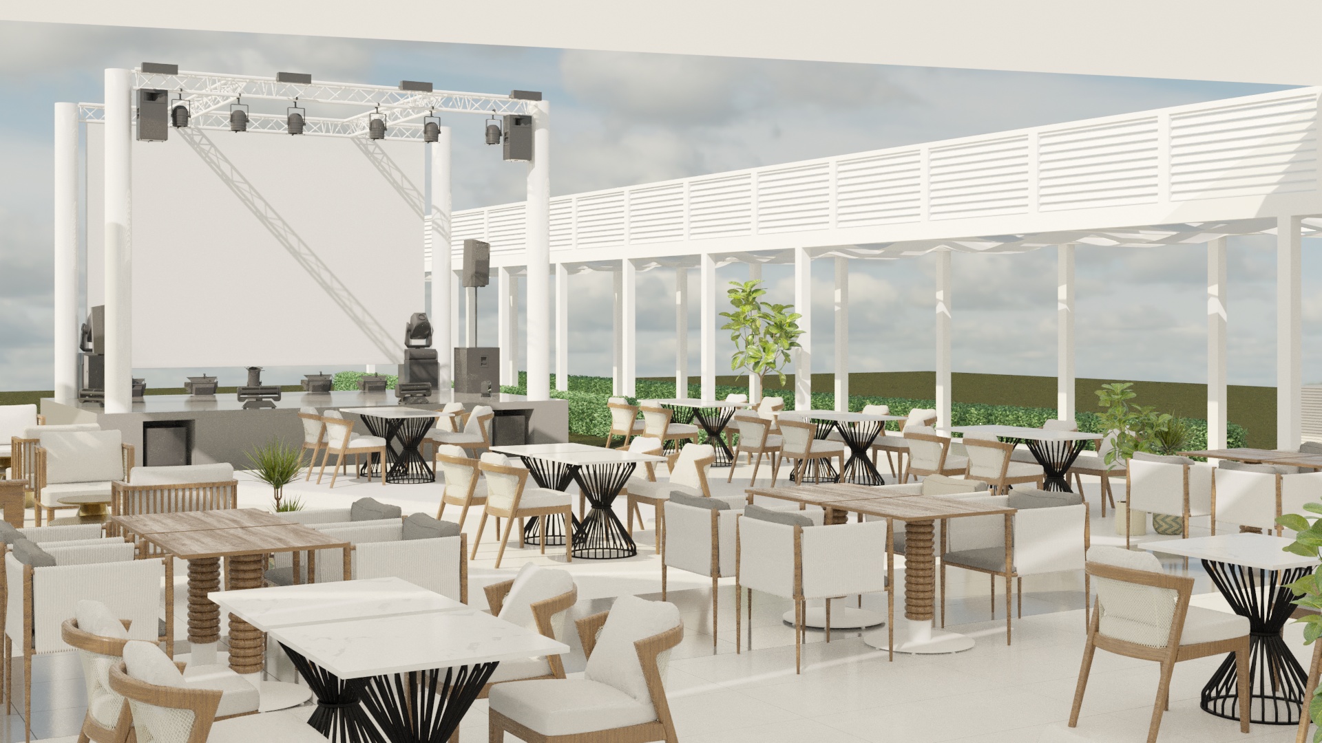 an open air restaurant luxurious and high quality furniture a spacious feel evenly distributed light beams green areas with small shrubs where the bushes and the sky merge