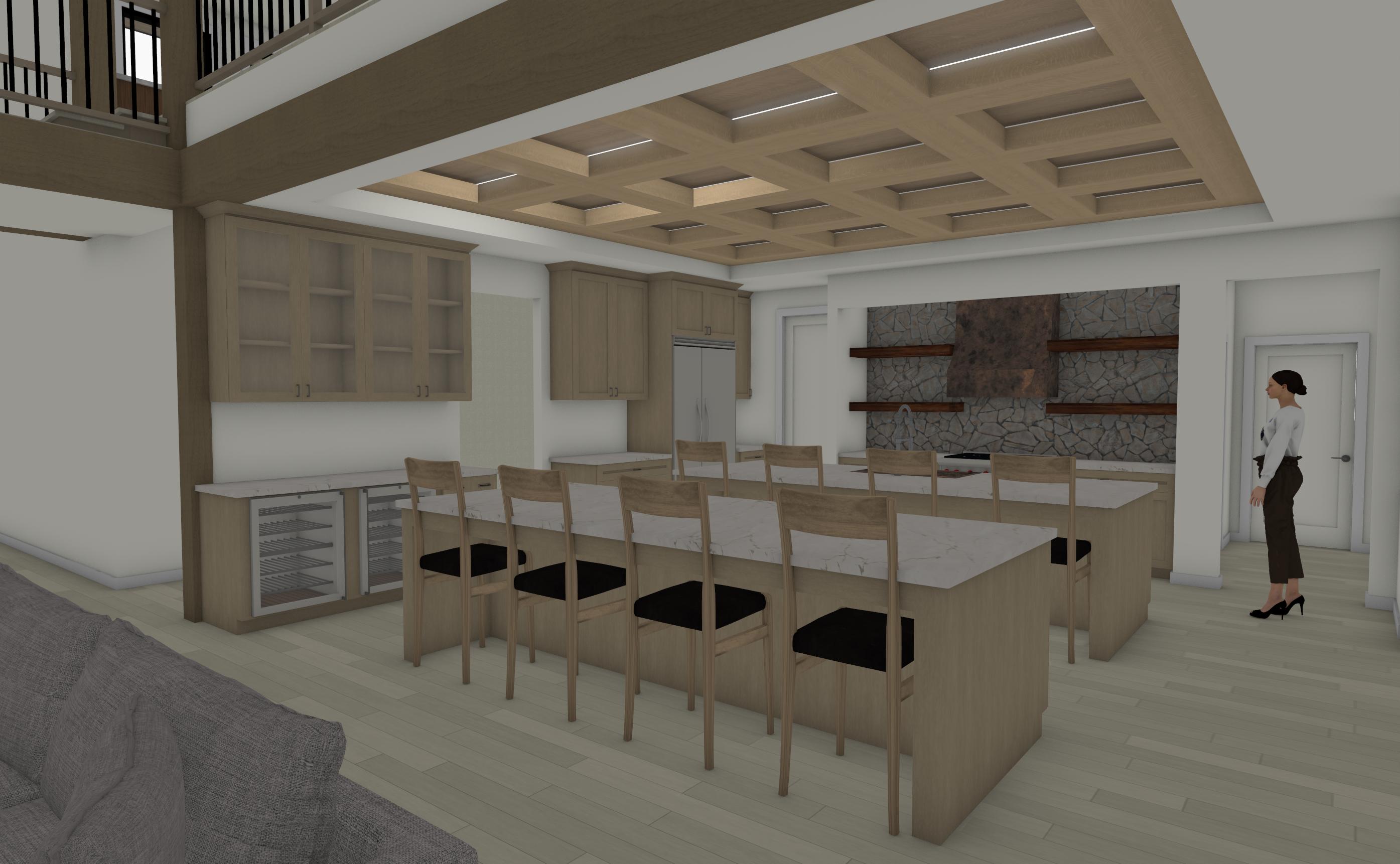 it s important to keep the sizes of everything the same change textures and materials but keep the sizes of everything the same make rock realistic its important to keep to scale the person in the photo is 5 6 for scale use her for scale and remove her from rendering do not change size of windows or doors do not add doors or windows do not change or add fixtures warm modern luxury kitchen large waterfall island with light gray marble or quartzite subtle veining polished finish thick countertop profile full height slab waterfall edges light natural wood cabinetry for lower cabs mixed with painted off white cabinets for upper cabinets and full height cabinets flat panel doors minimal hardware integrated appliances soft warm lighting oversized pendant lights with pleated fabric shades over one of the islands not both and brushed brass accents tall brass faucet neutral color palette creamy whites warm taupes light wood tones wide plank oak flooring clean and minimal styling high end residential design soft ambient glow architectural visualization ultra realistic 8k detail keep chairs at both islands the ceiling in kitchen wood is darker than cabs there is led light strips between ceiling and trim pieces with light coming out