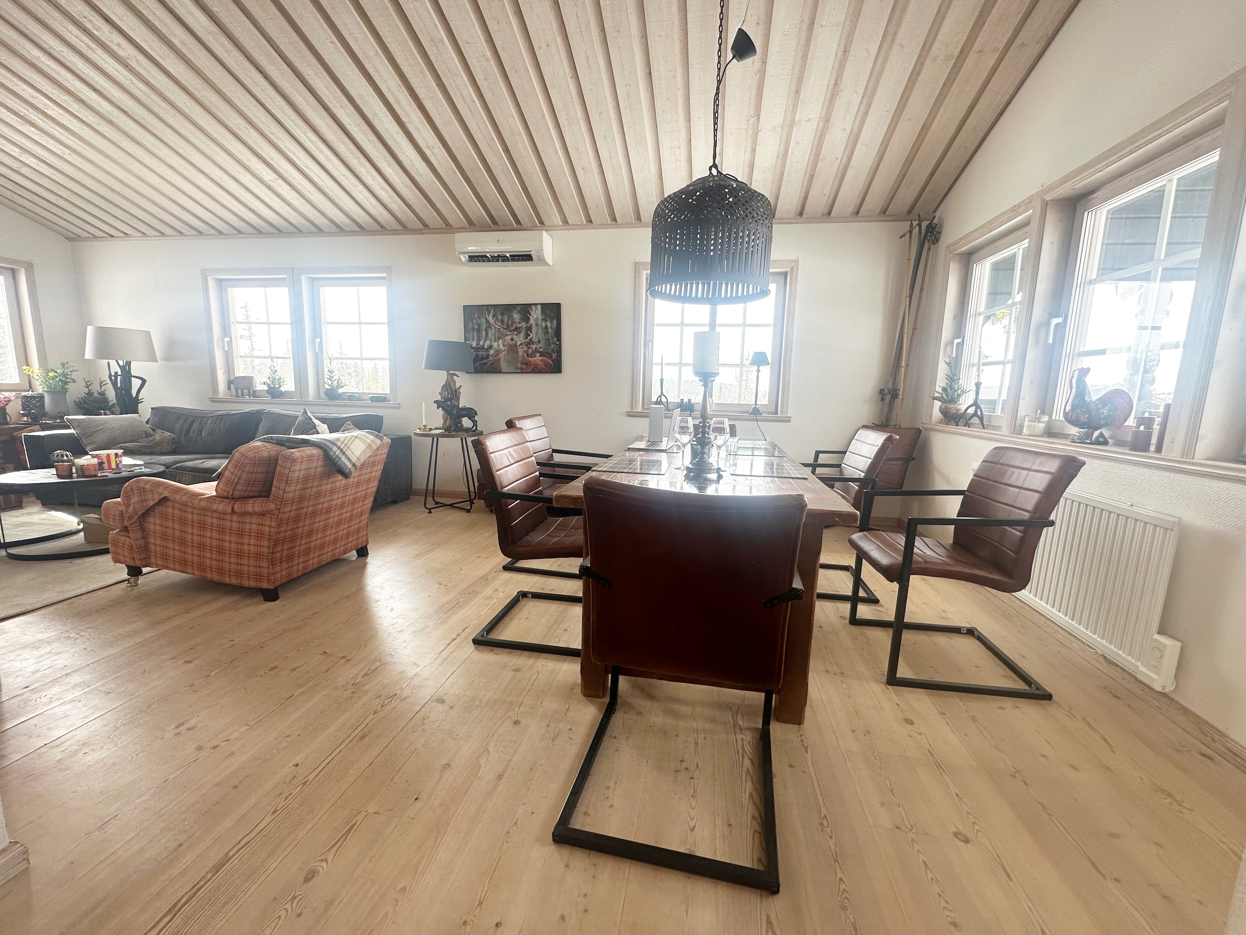 apply a dark gray green color to the front facing wall only and use the same color on the ceiling while preserving its rough wooden plank texture paint all window trims black