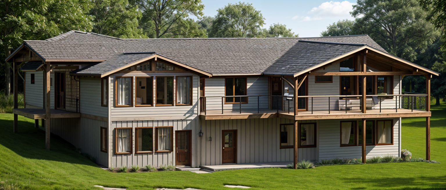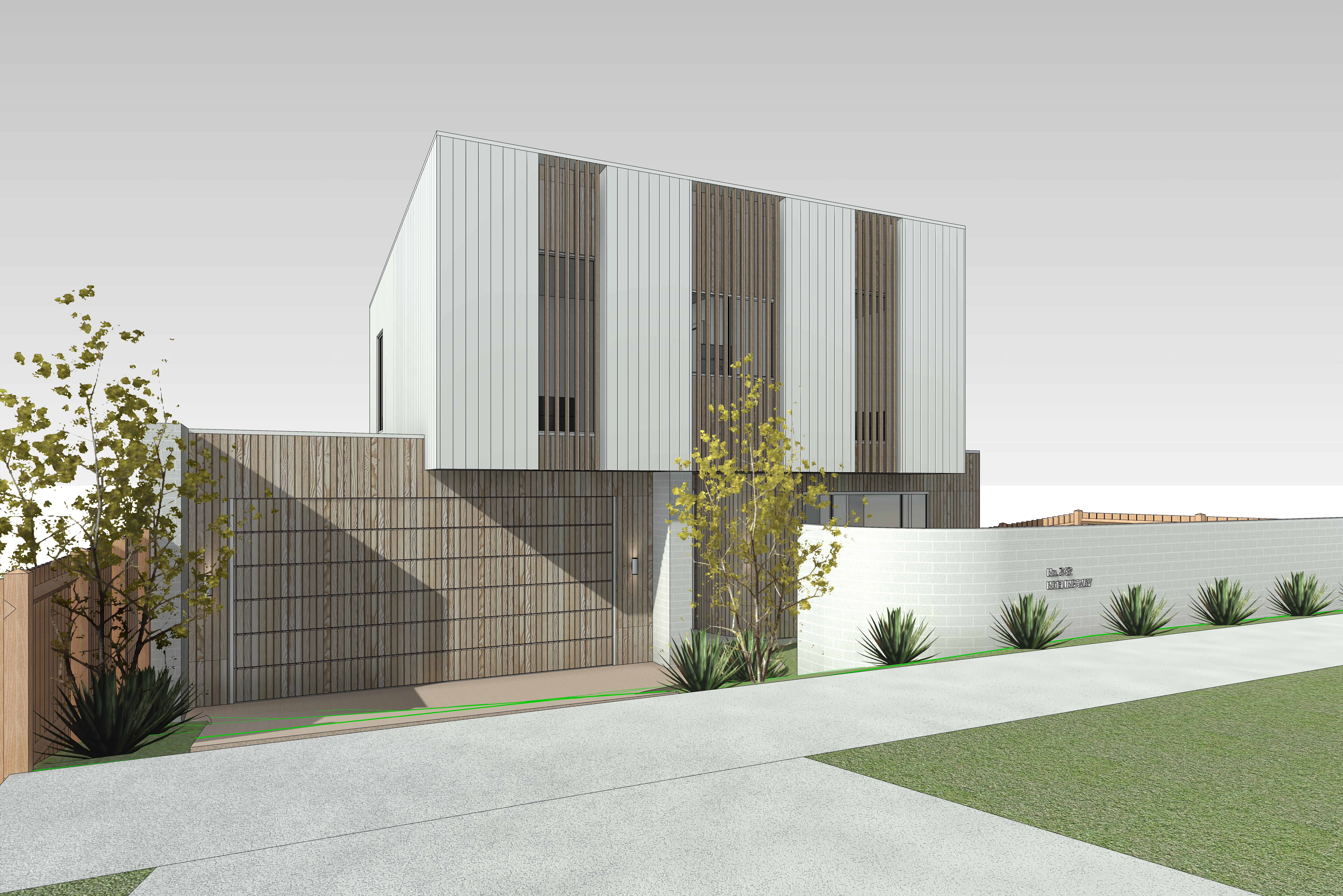 modern two story beach house located in australia white render cladding vertical hardwood beach timber cladding white batten screening over upper floor windows curved wall in entry nib brickwork walls either side of garage door white window frames landscaped front garden with mulch garden beds bushland feel and tall trees behind building in background partly cloudy sky day with morning sunlight from the mid right hand side