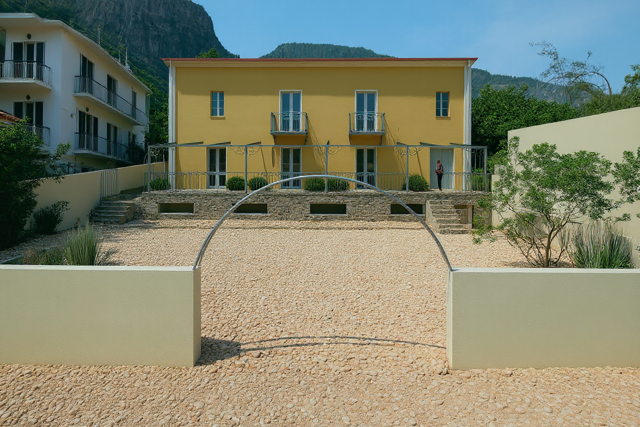 replace the beige pebble in front of the entrace with asphalt make it into road keep the pebble in the yard