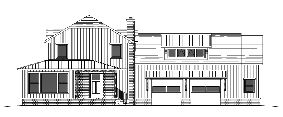 modernist exterior shot house exterior design in a modern farmhouse style featuring neutral color palette main walls in soft white with light gray vertical siding accents roof in matte charcoal grey with a subtle texture windows framed in dark bronze offering contrast front door in deep navy blue for a pop of color brickwork at the base in a light taupe garage doors in white with frosted glass panels atmosphere is serene and inviting with soft warm daylight casting gentle shadows lush green landscaping surrounding the house architecture