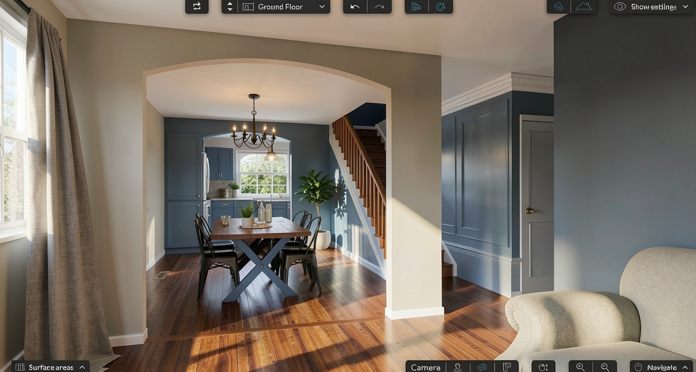 6pm evening a modern two story house with a sleek design and hip roofs featuring a dark neutral siding with darker trim medium to dark earthtone stone surrounds the entry and base the roof is a dark charcoal color adding contrast large windows dominate the facade reflecting the clear blue sky the front and garage doors are very dark stained wood surrounding the house a lush green lawn with colorful flower beds in shades of pink lavender and yellow lansdcape stones dot the yard framing plantings the atmosphere is serene and welcoming with evening sunlight casting gentle shadows do not modify the massing as shown